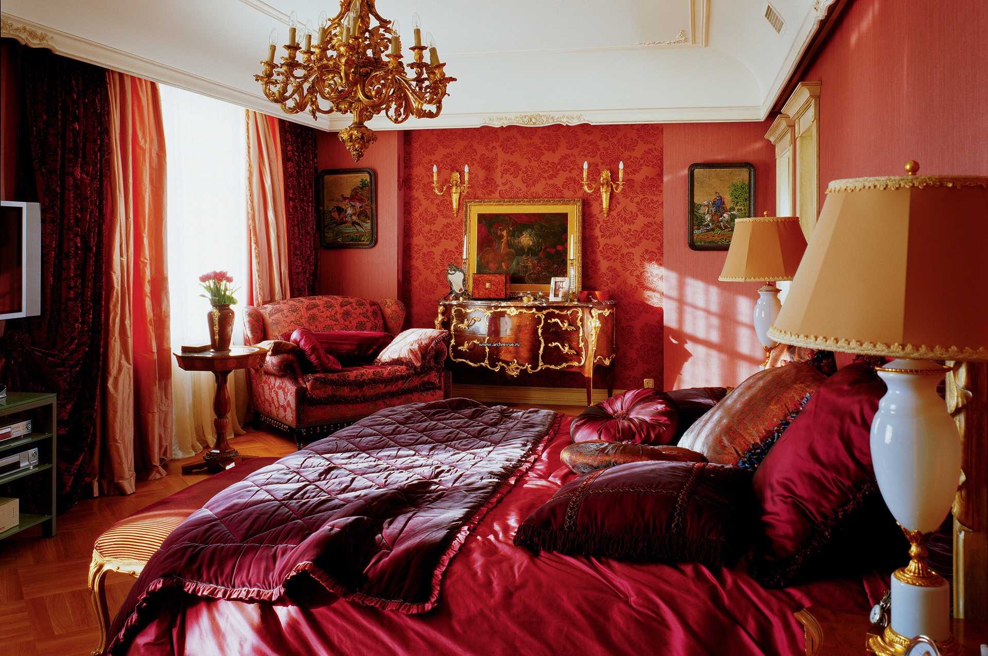 Интерьер спальни выполнен в стиле французских дворцовых интерьеров. Текстильные обои, шторы, обивка мебели, покрывала и подушки в яркой бордово-малиновой цветовой гамме. Куполообразный потолок с широким фризом и тонкой ажурной гипсовой лепниной. Центральная люстра покрыта сусальным золотом. Мебель Provasi, Angelo Cappellini, Palmobili, поставщик R-Studio.