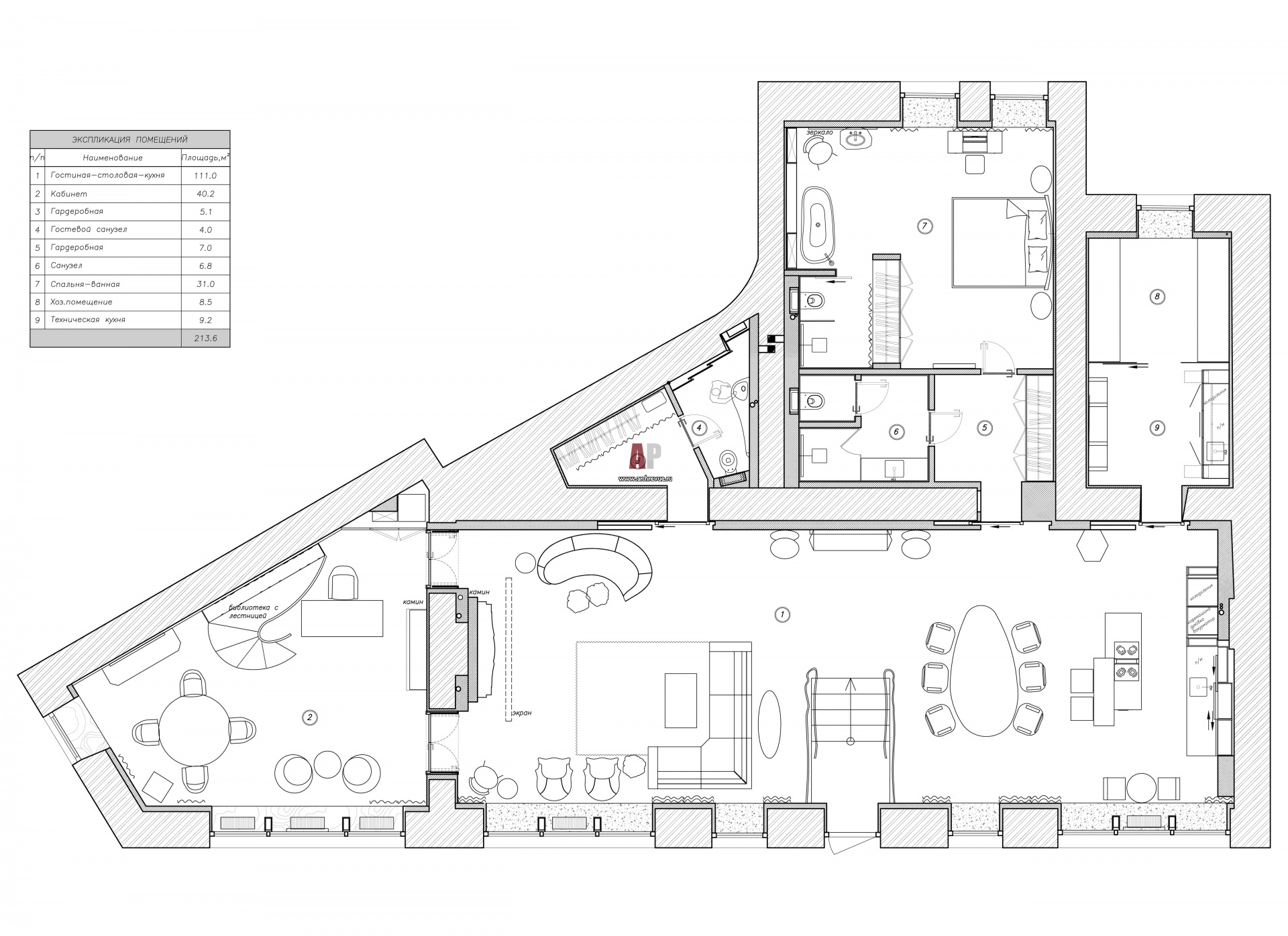 План трехкомнатной квартиры для приемов. Общая площадь - 214 кв. м.