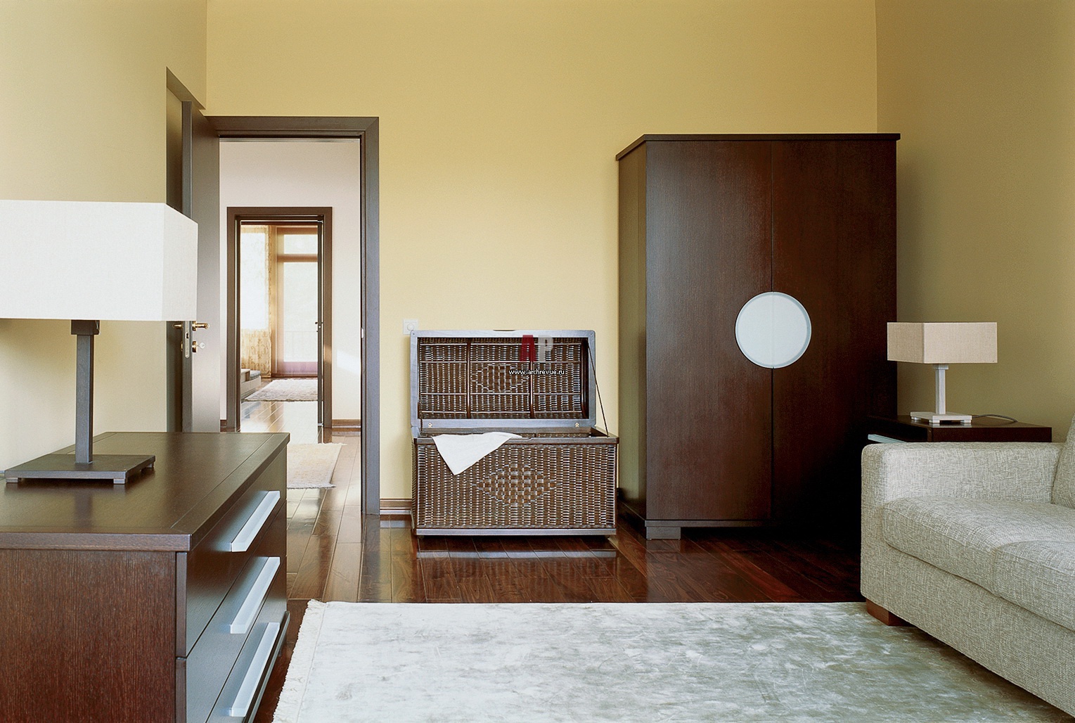 Дизайн гостевой спальни с азиатскими мотивами. Шкаф, комод из древесины венге, сундук из плетеной лозы хорошо читаются на фоне однотонных бежево-медовых стен.