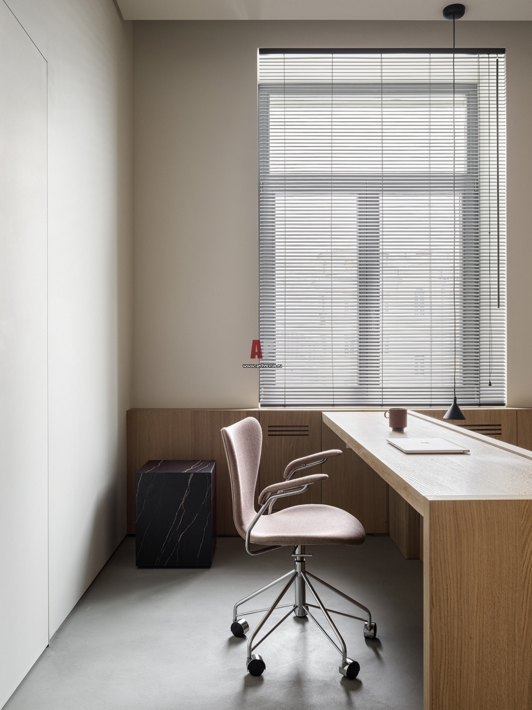 Рабочая зона в спальне расположена на подиуме с наливным полом. Стул, Fritz Hansen