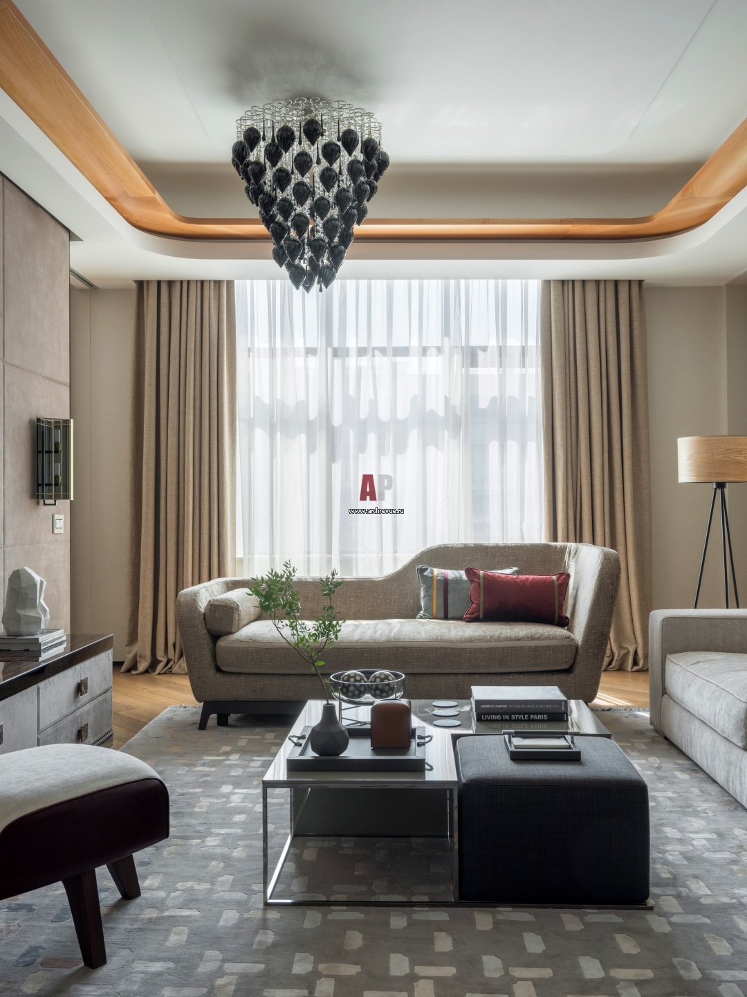 Потолок в гостиной отделан шпонированным гнутым карнизом. Люстра, Pataviumart. Диван, Milano Bedding. Стол, B&B Italia. Обои, ProSpero, коллекция Royal.