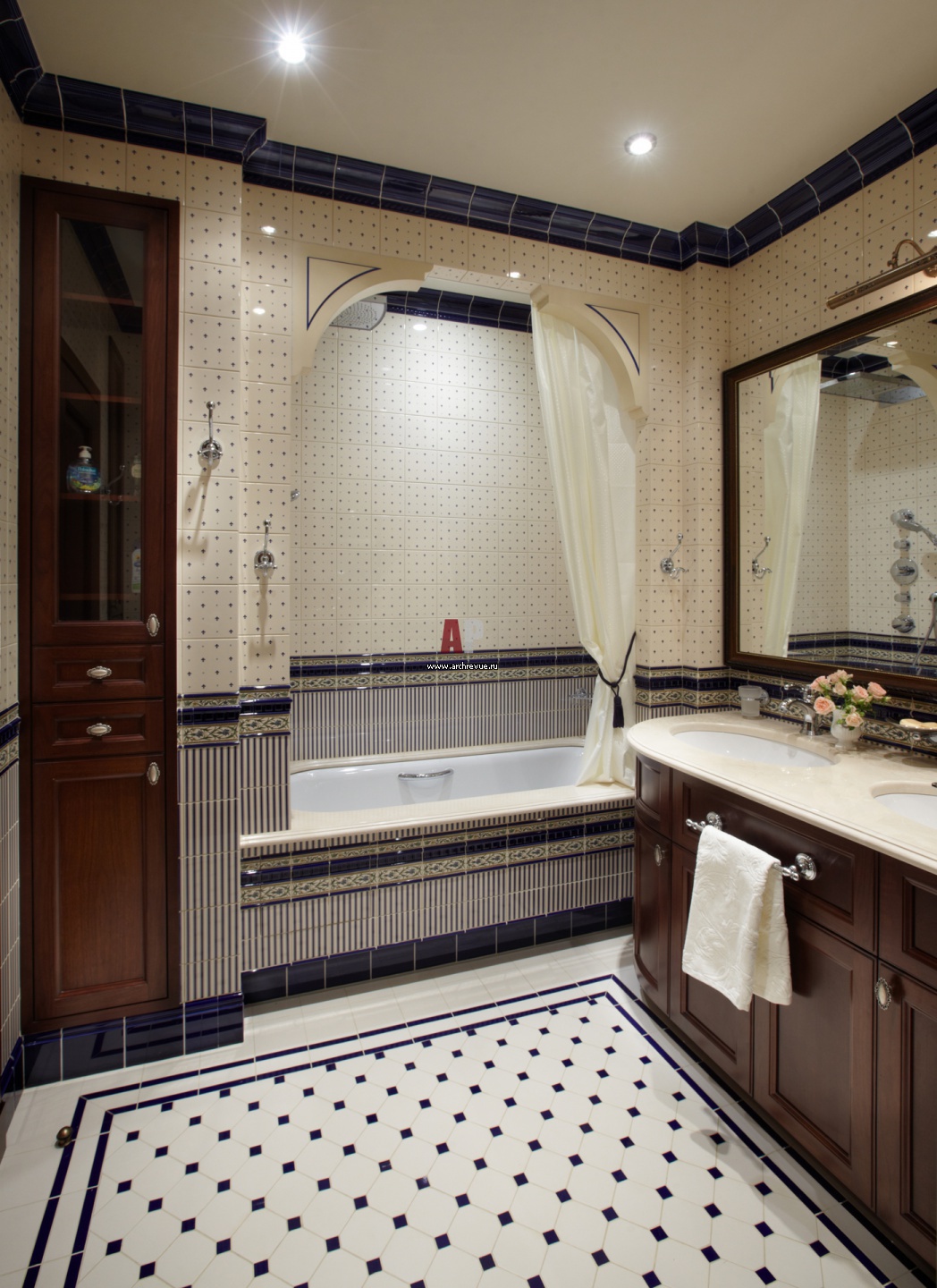 Детский санузел в английском стиле. Керамическая плитка Original Style, поставщик «Интерьерный салон» («Биг Бен»). В инженерный короб встроен вертикальный шкаф.