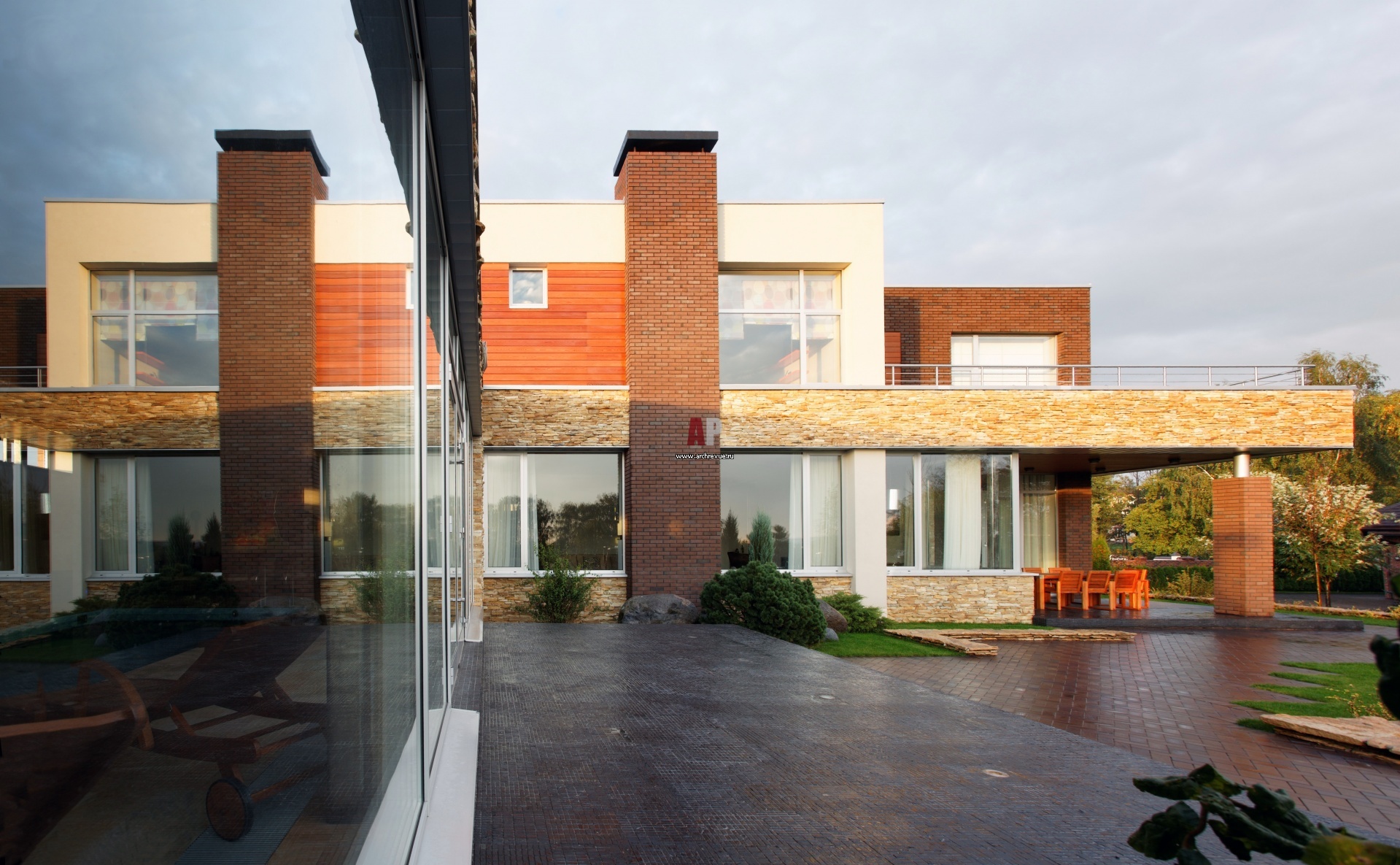 Модернистский дом выполнен в теплых тонах с обилием цветовых акцентов и аксессуаров, которые создают в нем позитивное настроение.