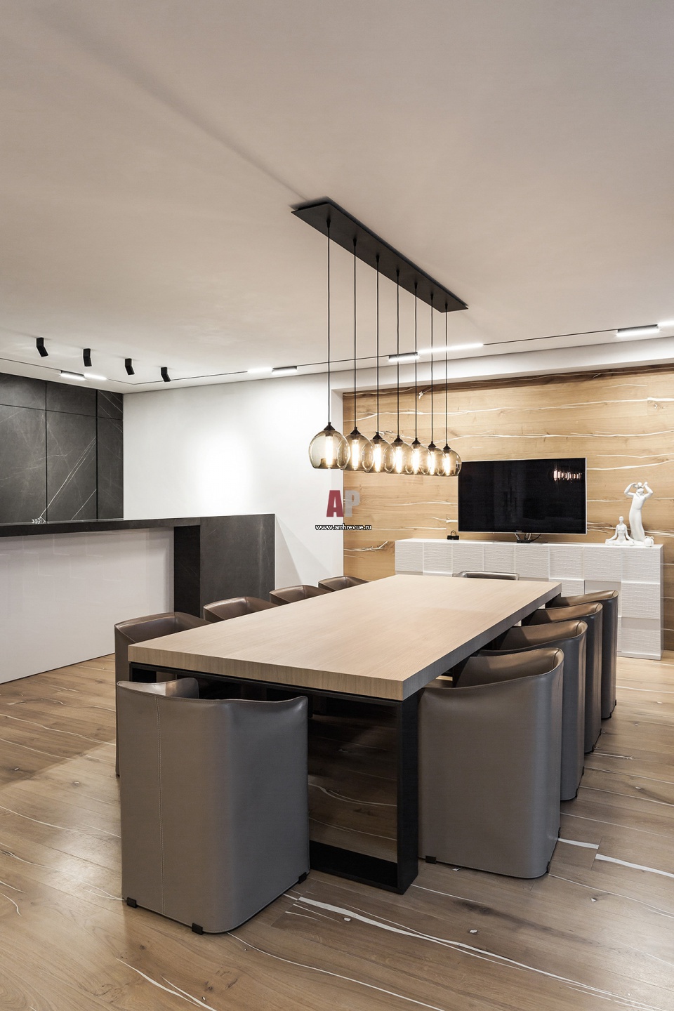 Столовая группа на кухне. Полы всех жилых помещений выложены палубной доской Mafi с красивой природной фактурой. Ею же зашита ниша в зоне столовой.