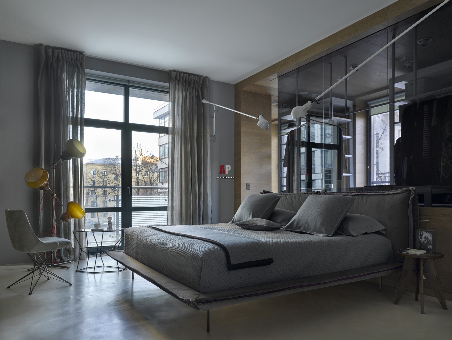 В объеме в форме куба спрятаны спальня и детская. В хозяйской спальне гардеробная сделана частью пространства. Она отделена полупрозрачной перегородкой из стекла скрывается. Кровать, Arketipo. Прикроватные столики, Vitra. Светильники, Flos.
