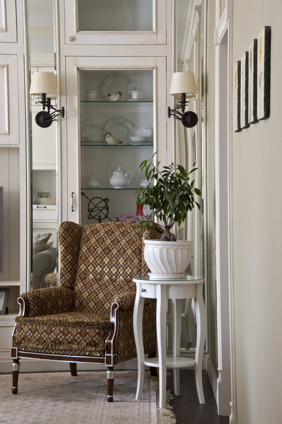 Уютная зона для отдыха в гостиной. За стеклом витрины – коллекция фарфора. Зеркальные вставки увеличивают и усложняют помещение гостиной. Бра с кованым основанием и тканевым абажуром выполнены в стилистике Прованса.