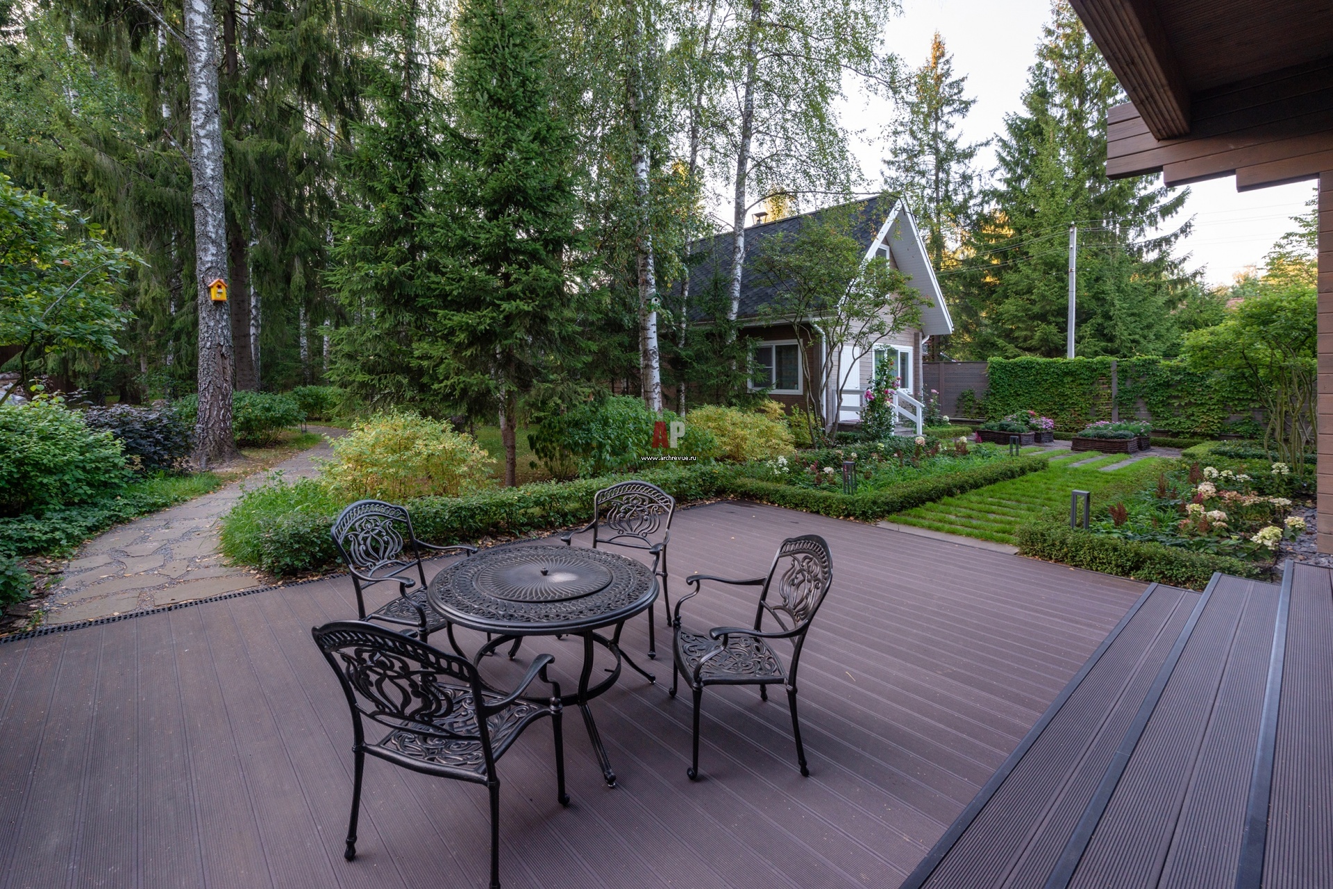 Зона отдыха за домом. Деревянный настил террасы смонтирован в один уровень с уличным мощением. Этот прием стирает границы между патио и лесной частью участка.
