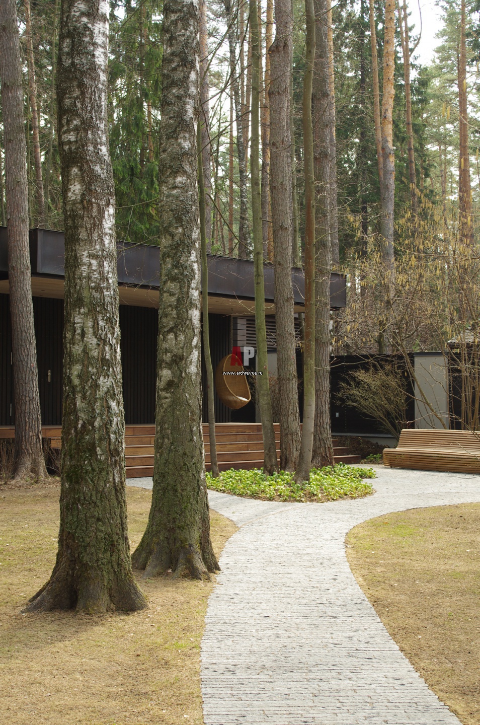 Фасад банного комплекса. Отдельностоящая постройка с плоской кровлей, выходящей широким навесом, выполнена в стиле модернизм.