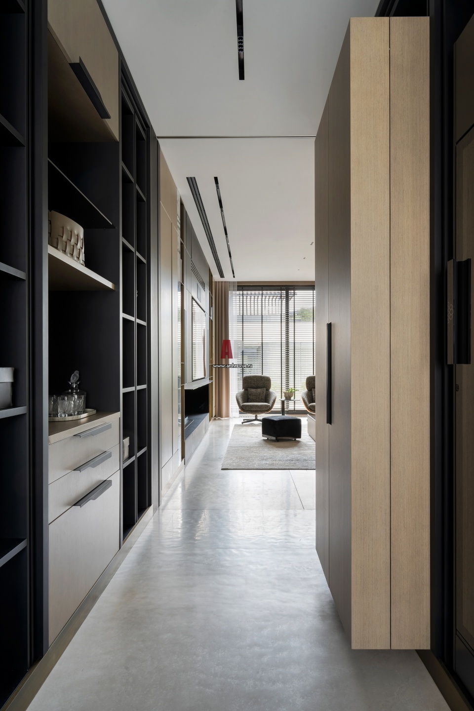 Через гостиную можно попасть в кабинет главы семьи, через винотеку. Помещения отделяется сдвижными в ниши стеклянными дверями. В нем есть винные шкафы, небольшой хьюмидор, дегустационная зона и открытые стеллажи.