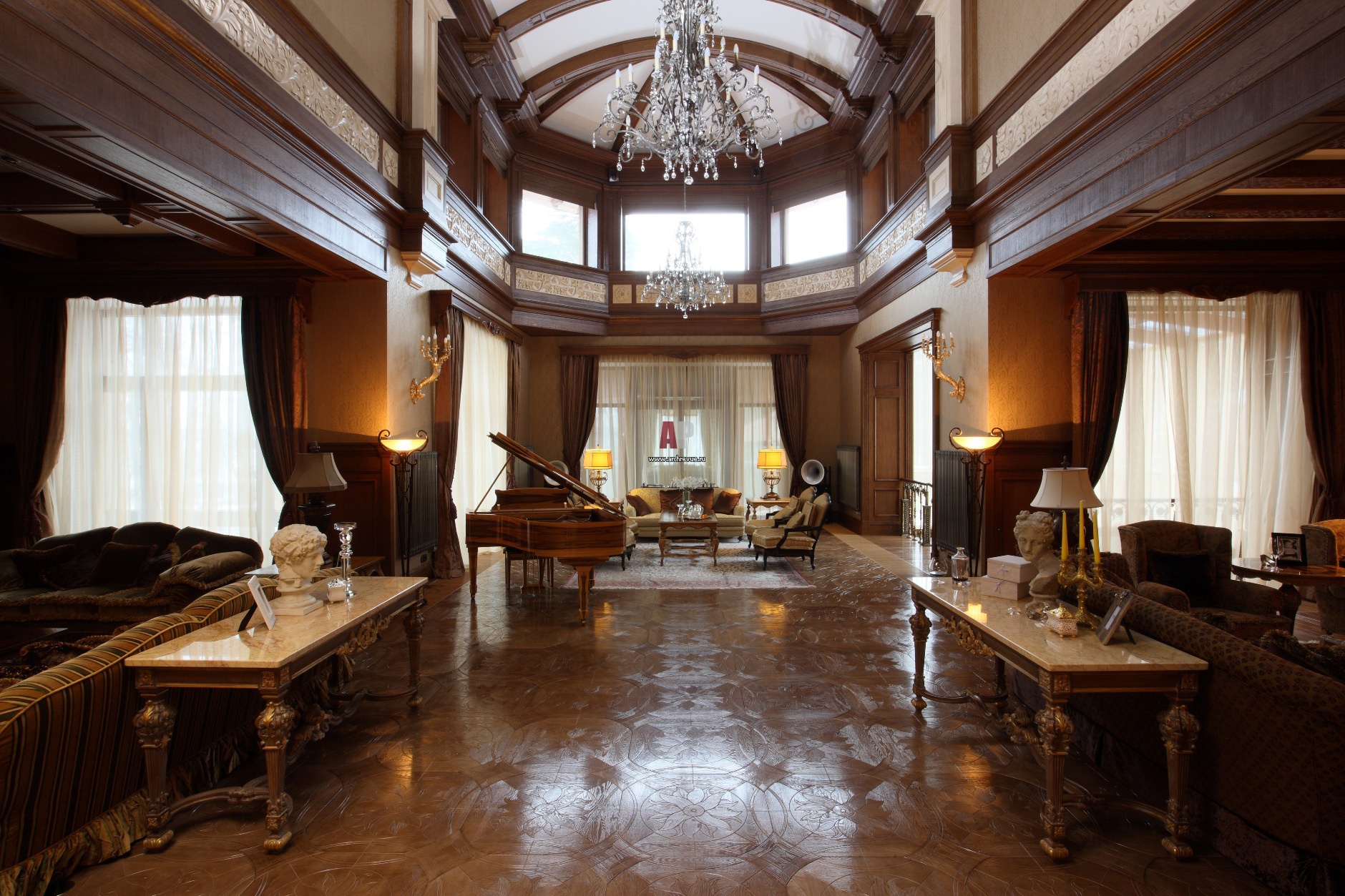 В центральной части гостиной расположена зона для домашних концертов. Слева и справа от входа - телевизионная и каминная зоны. Авторский дизайн гостиной выполнен с использованием обоев Nobilis, York и Zuber. Стены отделены от потолка массивным деревянным карнизом-основой сложных полукруглых балок, изготовление «Ассоциация русских мастеров». Все пространство опоясывает деревянный фриз, украшенный тончайшей лепниной, изготовление «РЕАЛЬ».