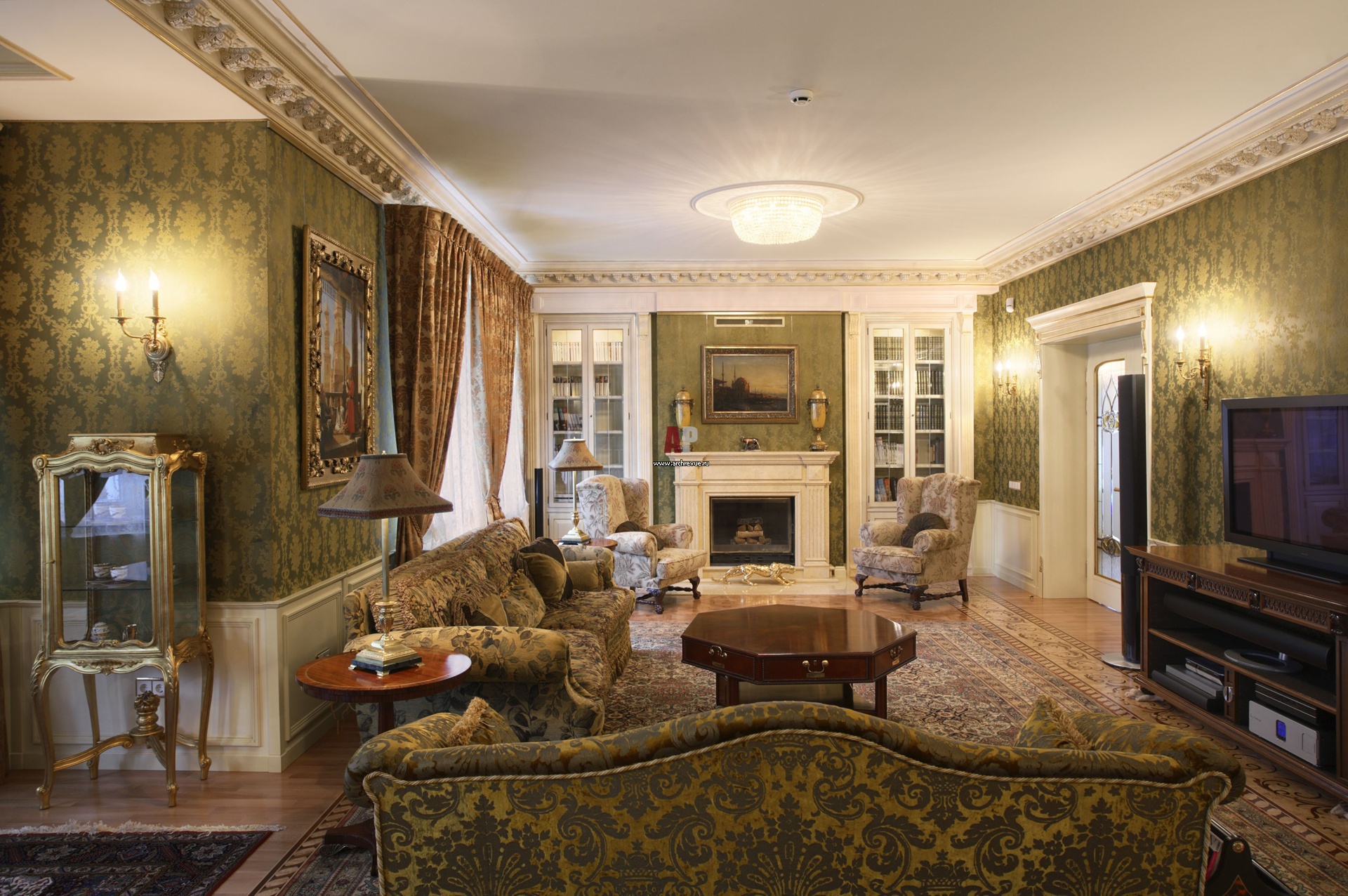 Каминный зал в классическом стиле. Резной портал камина из мрамора. Круглый хрустальный светильник отлично освещает помещение и не съедает высоту.