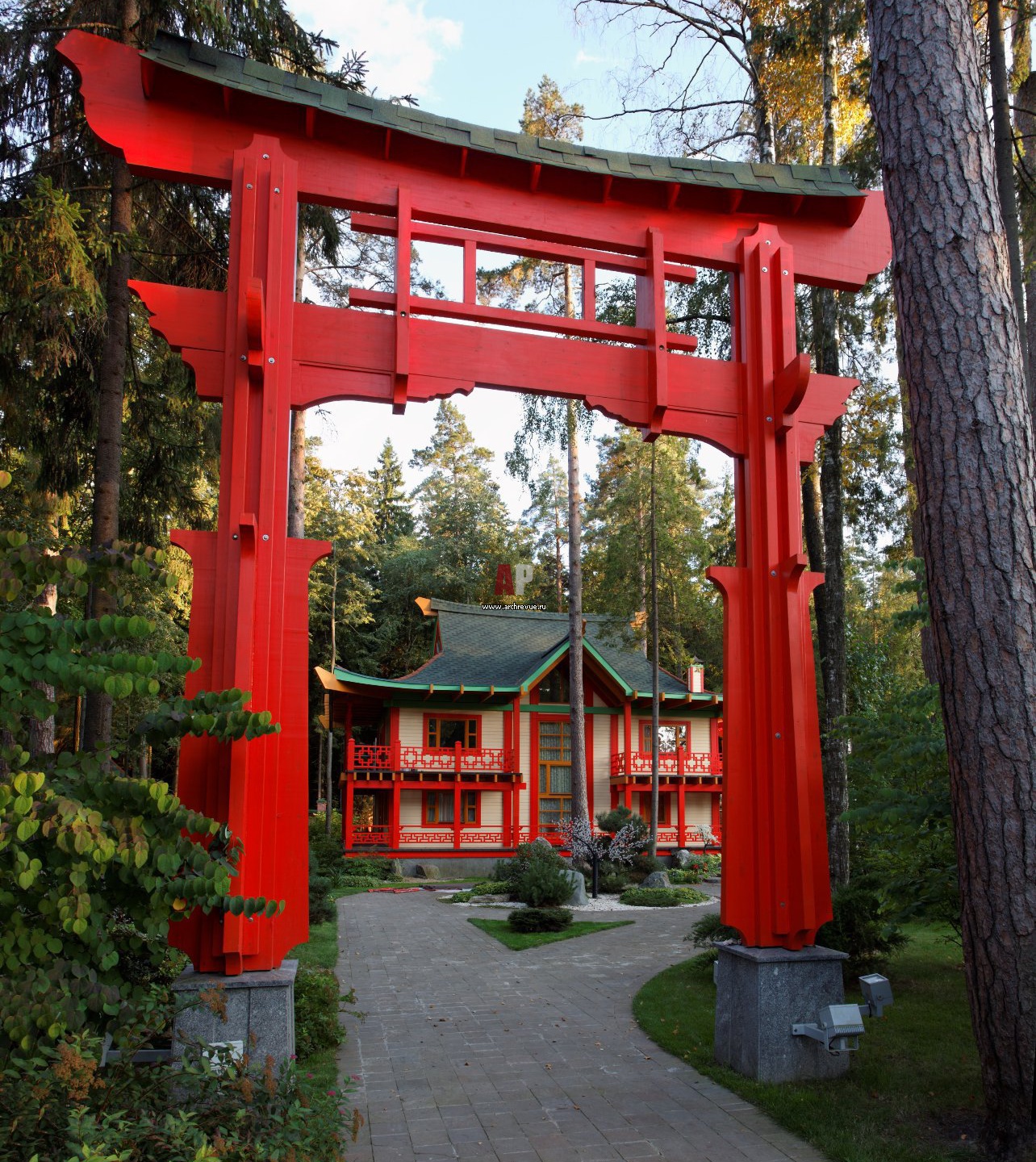 Подход к дому предваряют ворота тории – японские ритуальные ворота без створок, из двух столбов, соединённых сверху двумя перекладинами. Они выкрашены в красный цвет.