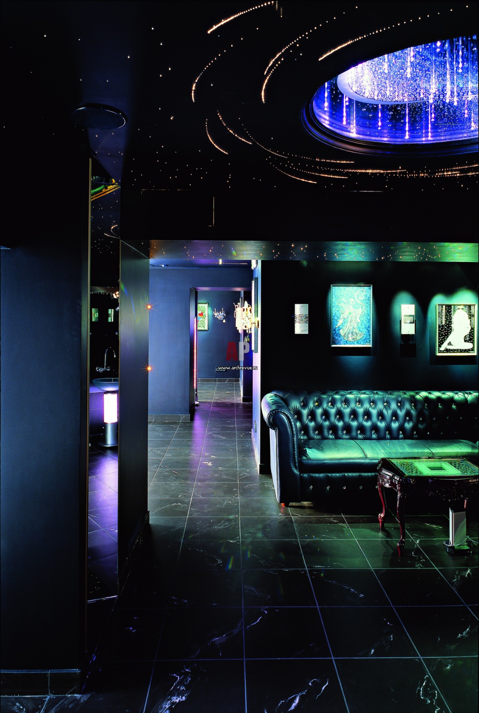 Темные стены, черные глянцевые полы, кожаная барочная мебель создают парадную обстановку. Покраски выполнены мастерами компании «Дом Краски / Деко – Эм».