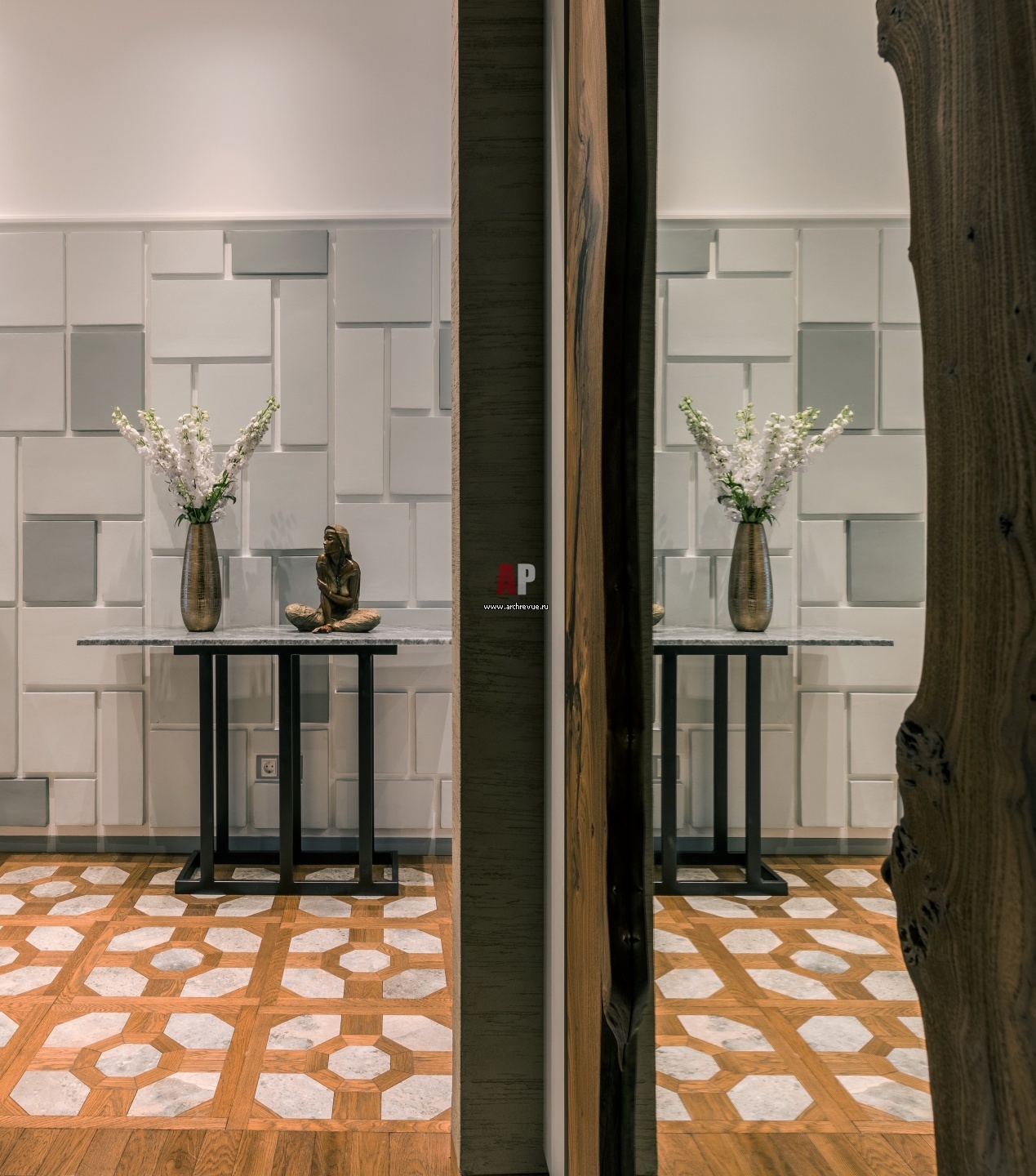 В прихожей сделан оригинальный шкаф с раздвижной дверью из слэба карагача с зеркальной вставкой. Стены отделаны объемными прямоугольными панелями из листов ГКЛ. Панели плотно прикручены друг другу и покрашены в разные оттенки серого цвета. Консоль, Ambicioni.