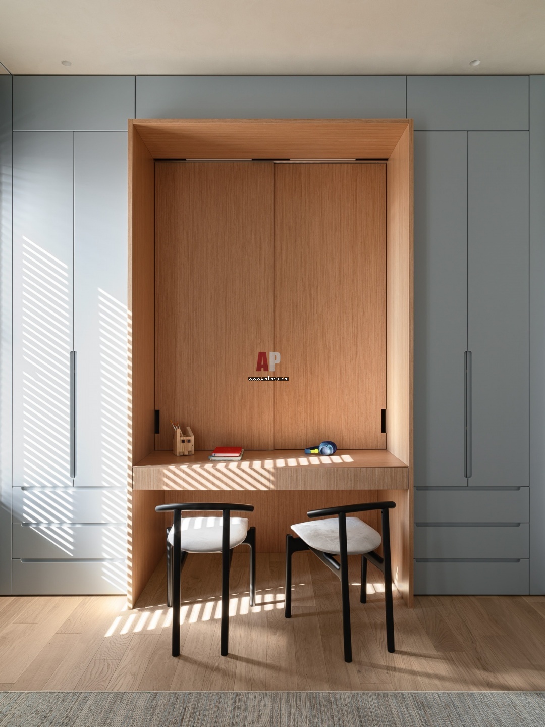 Комната мальчиков. Квартира полна солнечного света. Жалюзи придают интерьеру строгость за счет красивой игры солнечных отражений. Система хранения для двоих детей не создает визуальной перегруженности. По краям – индивидуальные шкафы, а в центре общий рабочий стол, длина которого позволяет заниматься вдвоем. Книжная полка скрыта за фасадами.