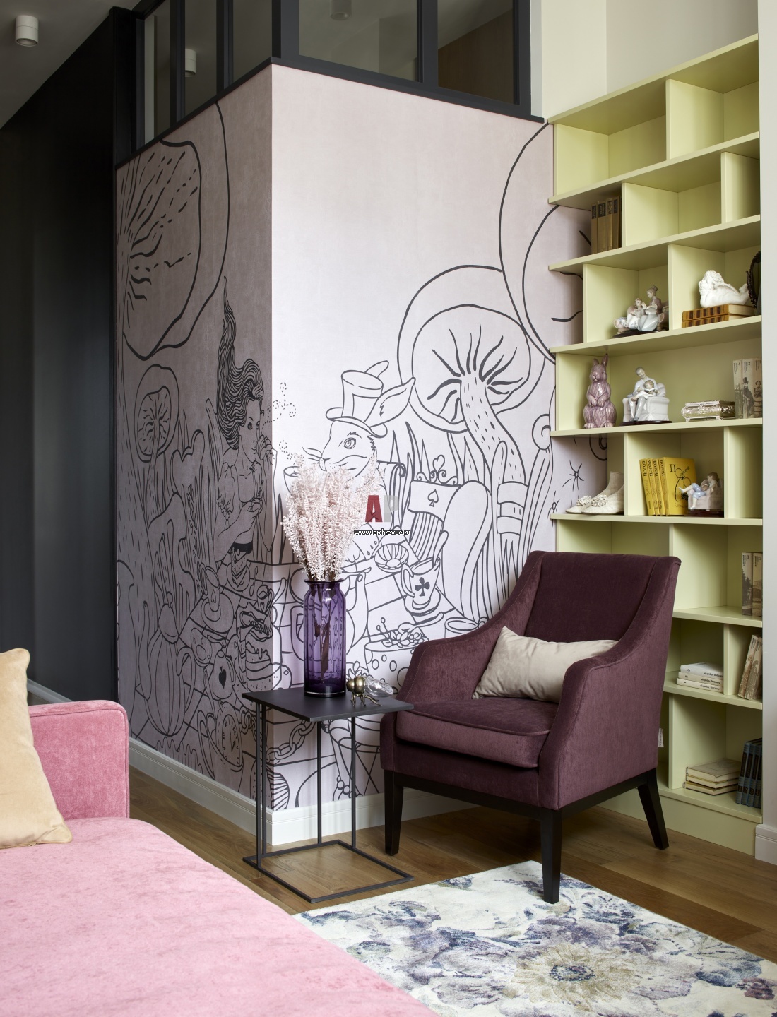 Интерьер детской комнаты с большой игровой зоной. Стены украшены росписью по мотивам «Алисы в Стране Чудес». Светильники, Karman и Eglo. Мягкая мебель, Dantone Home.