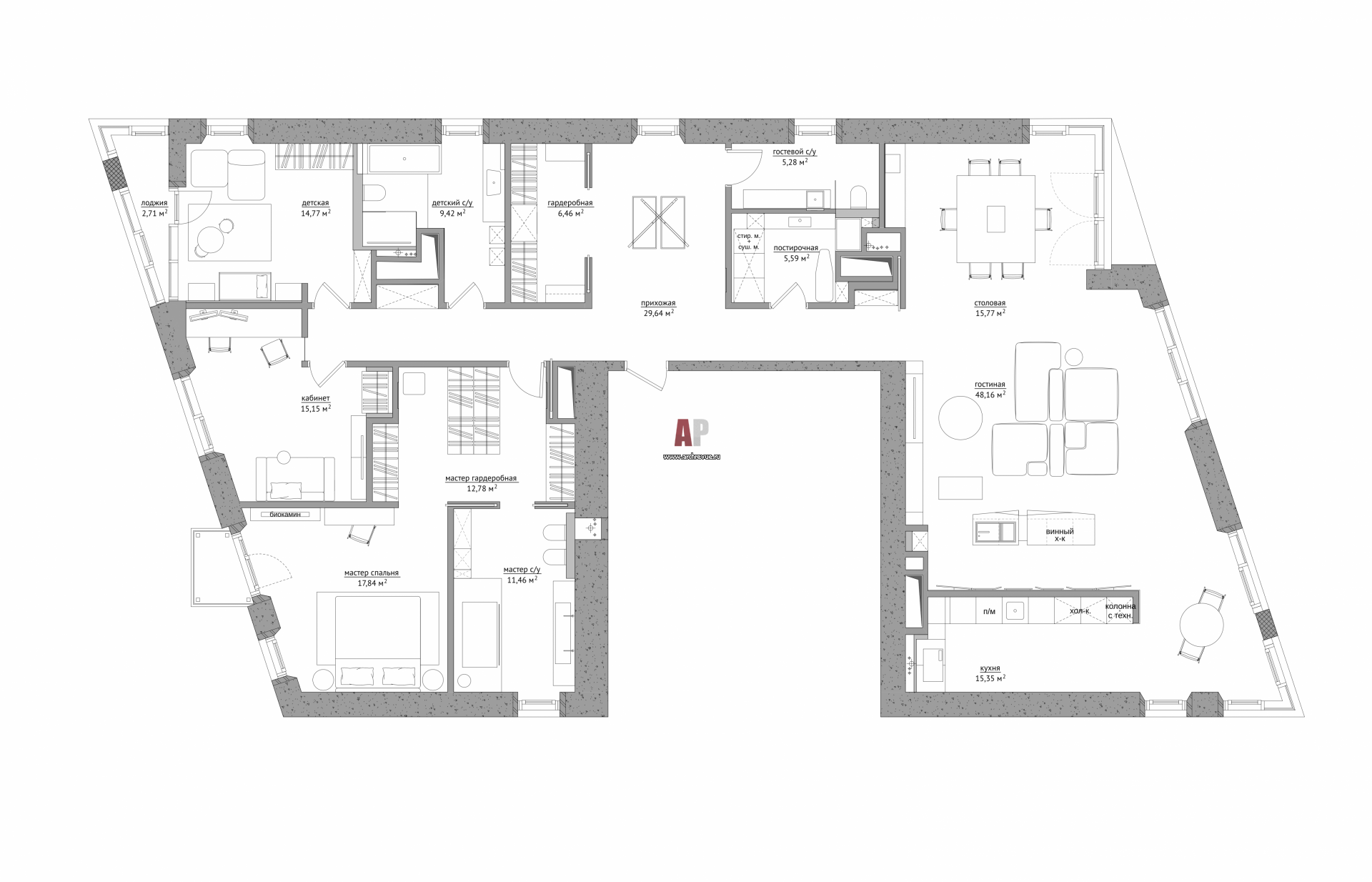 Планировка квартиры для молодой семьи в элитной новостройке, 115 кв. м.