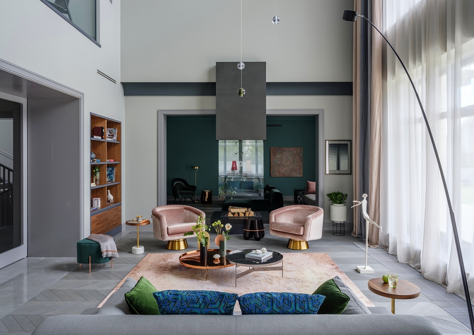 Загородный дом для большой семьи. Интерьер гостиной. Панорамный камин отделяет камерную ТВ-комнату, она находится в глубине и выполнена в темных зеленых тонах. Кресла, Jonathan Adler. Столики, Pianca. Латунный столик на мраморном основании сделан на заказ, по эскизам автора проекта.