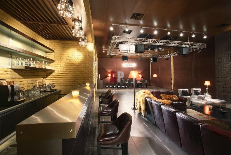 Бар оформлен с помощью декоративного кирпича, поставщик «Строй-С», с применением декоративных покрасок. Краски - поставщик «Франс-Деко’Р». Барная стойка выполнена по авторским эскизам и изготовлена компанией State-art, барные стулья - Сheccotty, поставщик «Студия 21». Светильники над баром- iGuzzini, поставщик «Пайл»