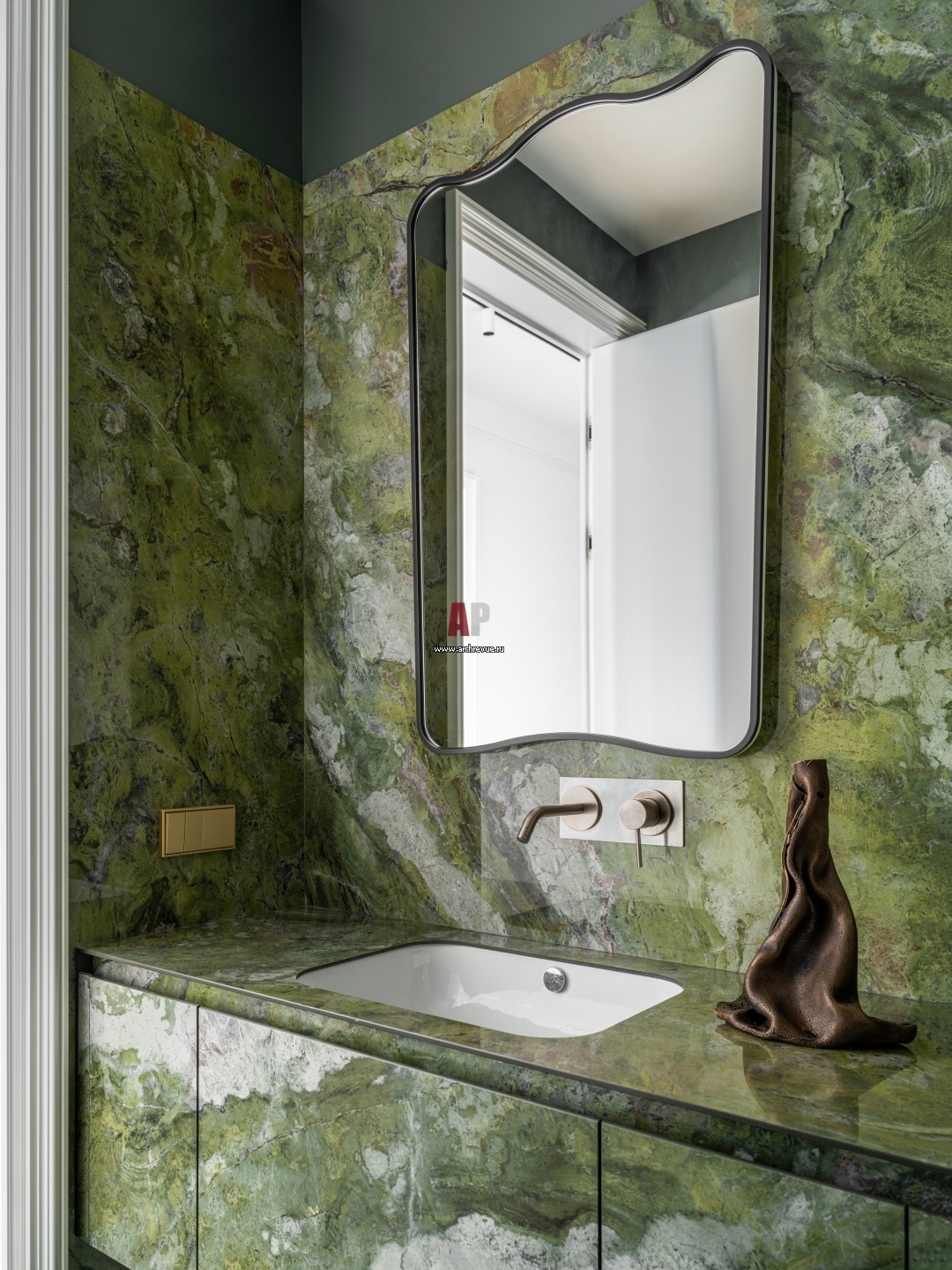 Один из санузлов облицован мрамором насыщенного зеленого цвета. Камнем оформлены даже фасады умывальника. Зеркало изготовлено на заказ.