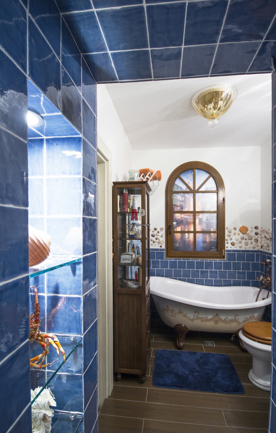Дизайн ванной комнаты в стиле кантри. Роспись с изображением арочного окна создает ощущение загородного дома. Отдельно стоящая ванна на лапах украшена декоративной росписью.
