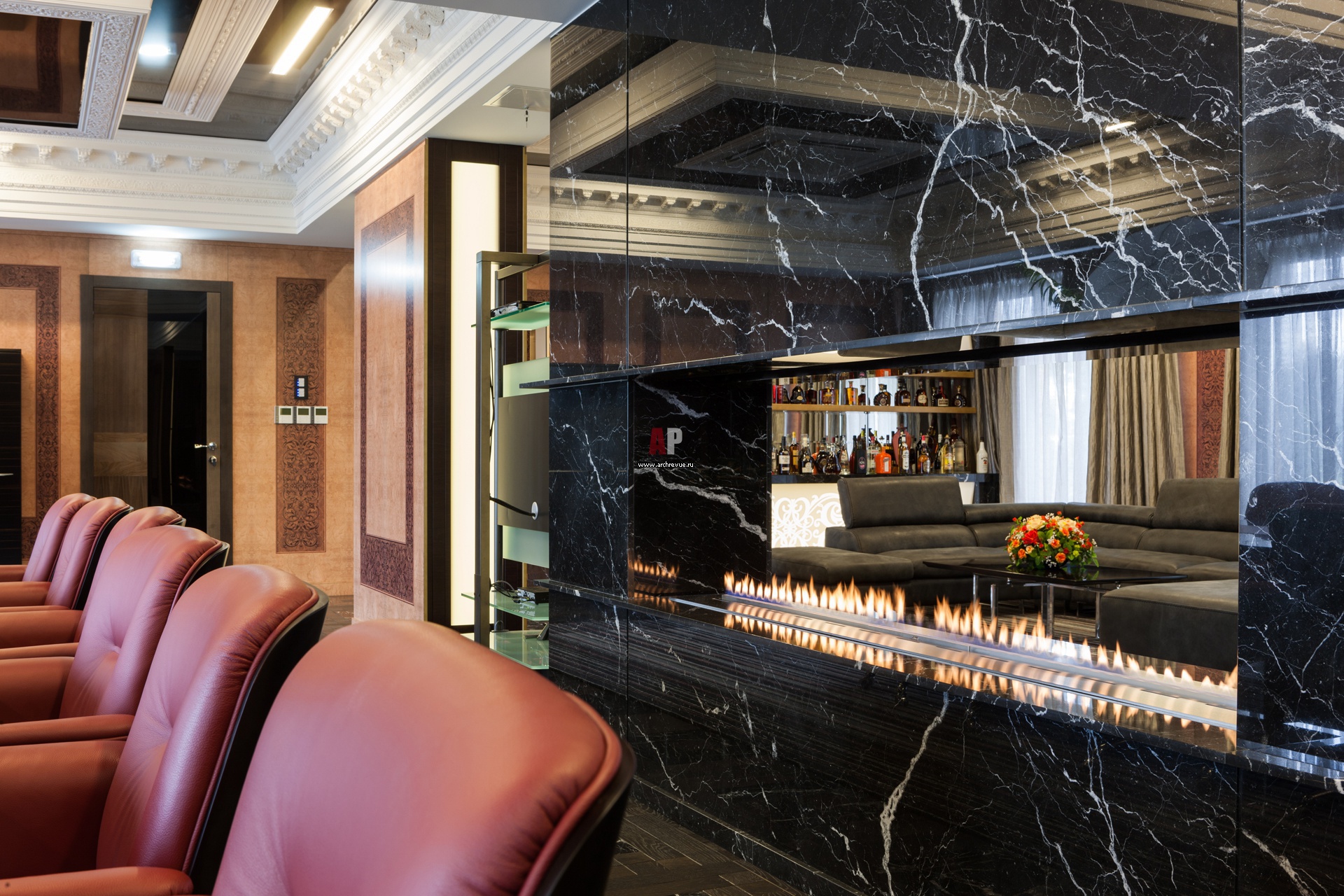 Со стороны переговорной через портал камина видна зона отдыха. Портал камина выполнен из черного мрамора сорта Negro Marquino. В него вмонтирован электрокамин, длиной 2,20 м.