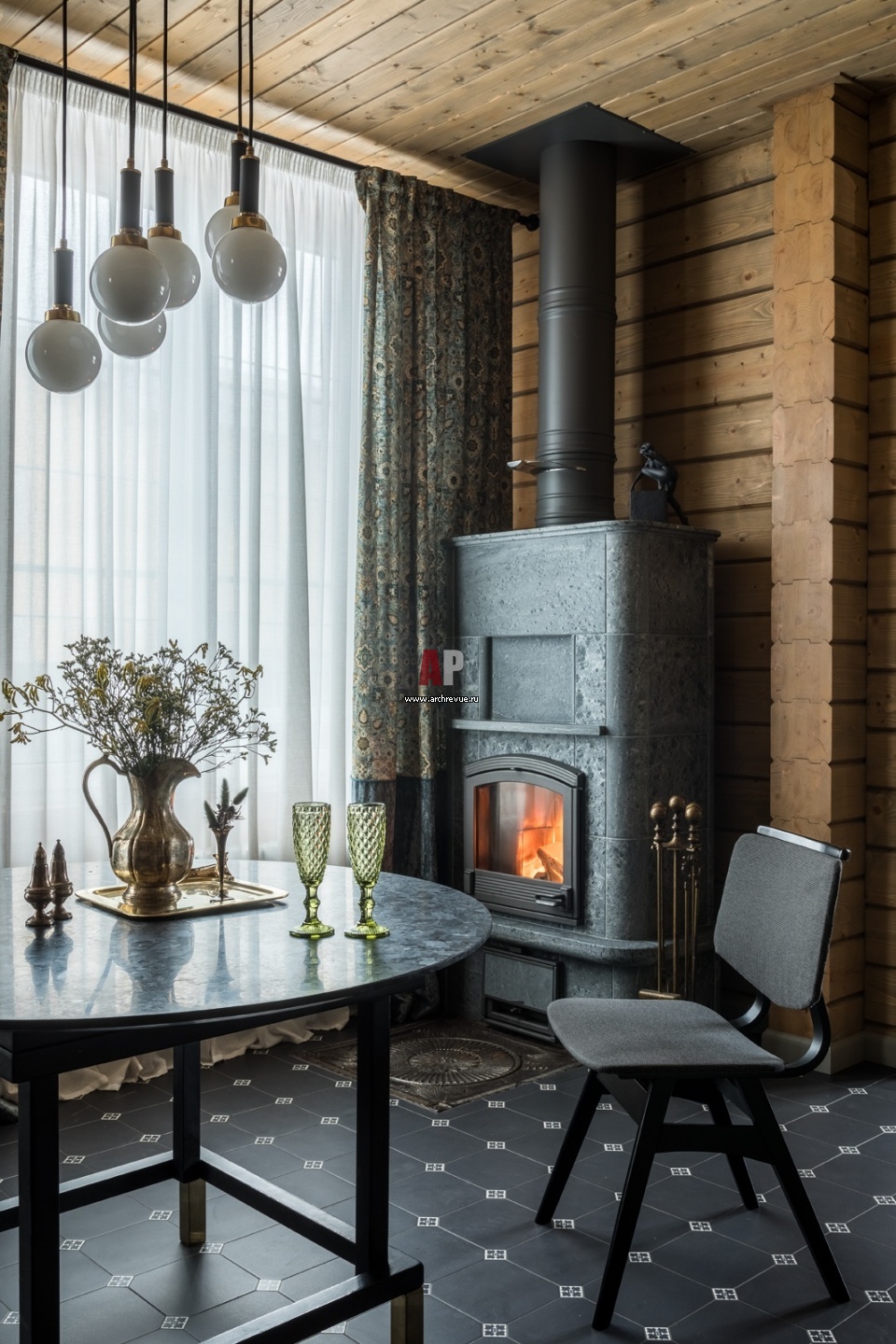 Стены и потолки оставлены деревянными, в качестве финишного материала было использовано масло Biofa (фактура «Мокрый песок») с мебельной полировкой. Оно сохраняет текстуру дерева и дает легкую тонировку с природным зеленоватым оттенком.