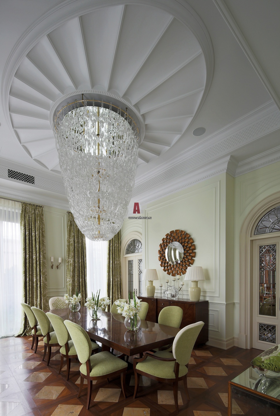 На полу столовой – паркет из ореха со вставками из мрамора. Потолок украшен большой овальной лепной розеткой — она практически одного размера со столом – и каскадной стеклянной люстрой в форме артишока.