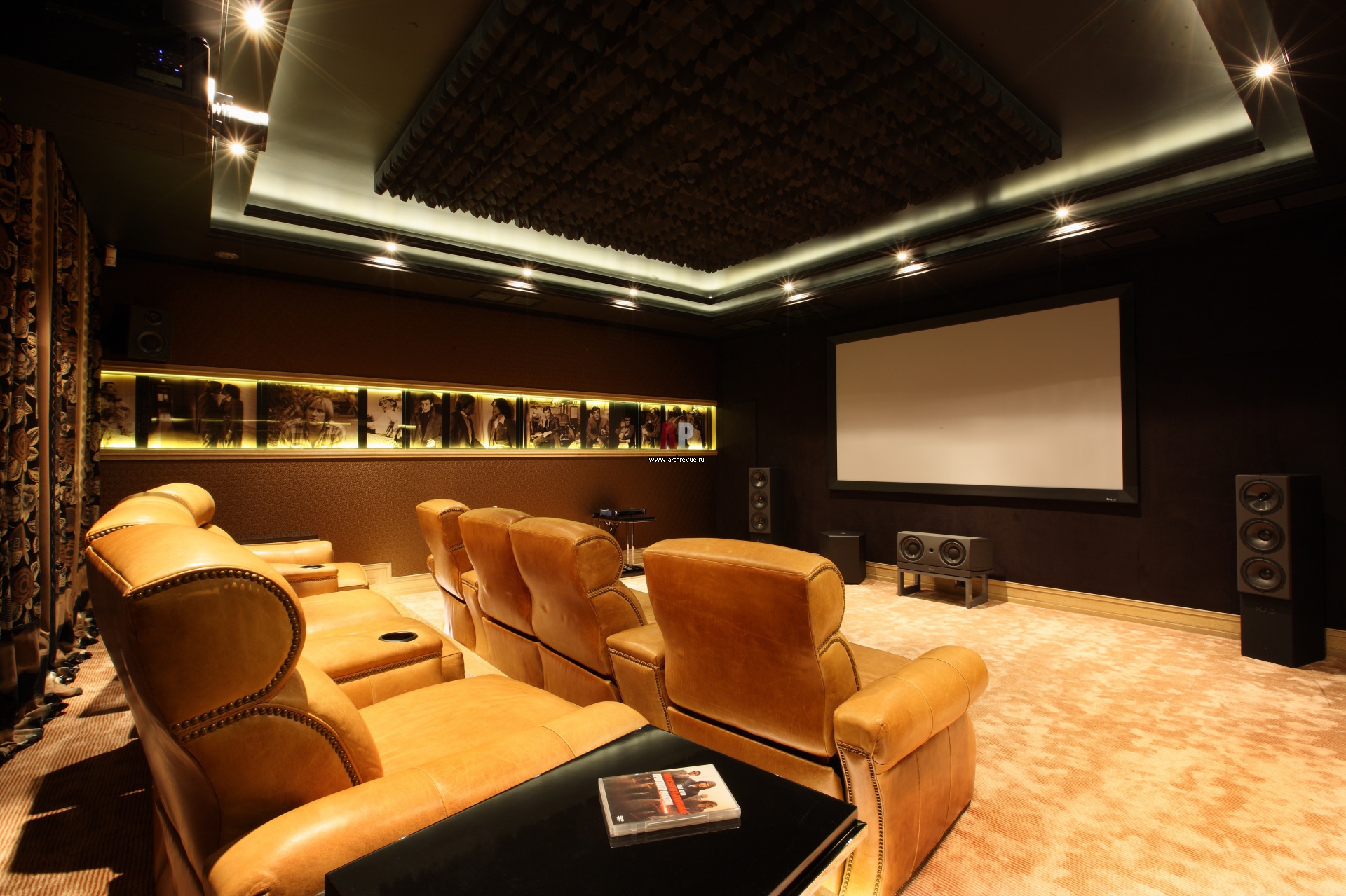 На фото – интерьер домашнего кинозала в частном загородном доме. Он рассчитан на 8 человек, стены украшены лентой постеров со сценами из известных кинофильмов.