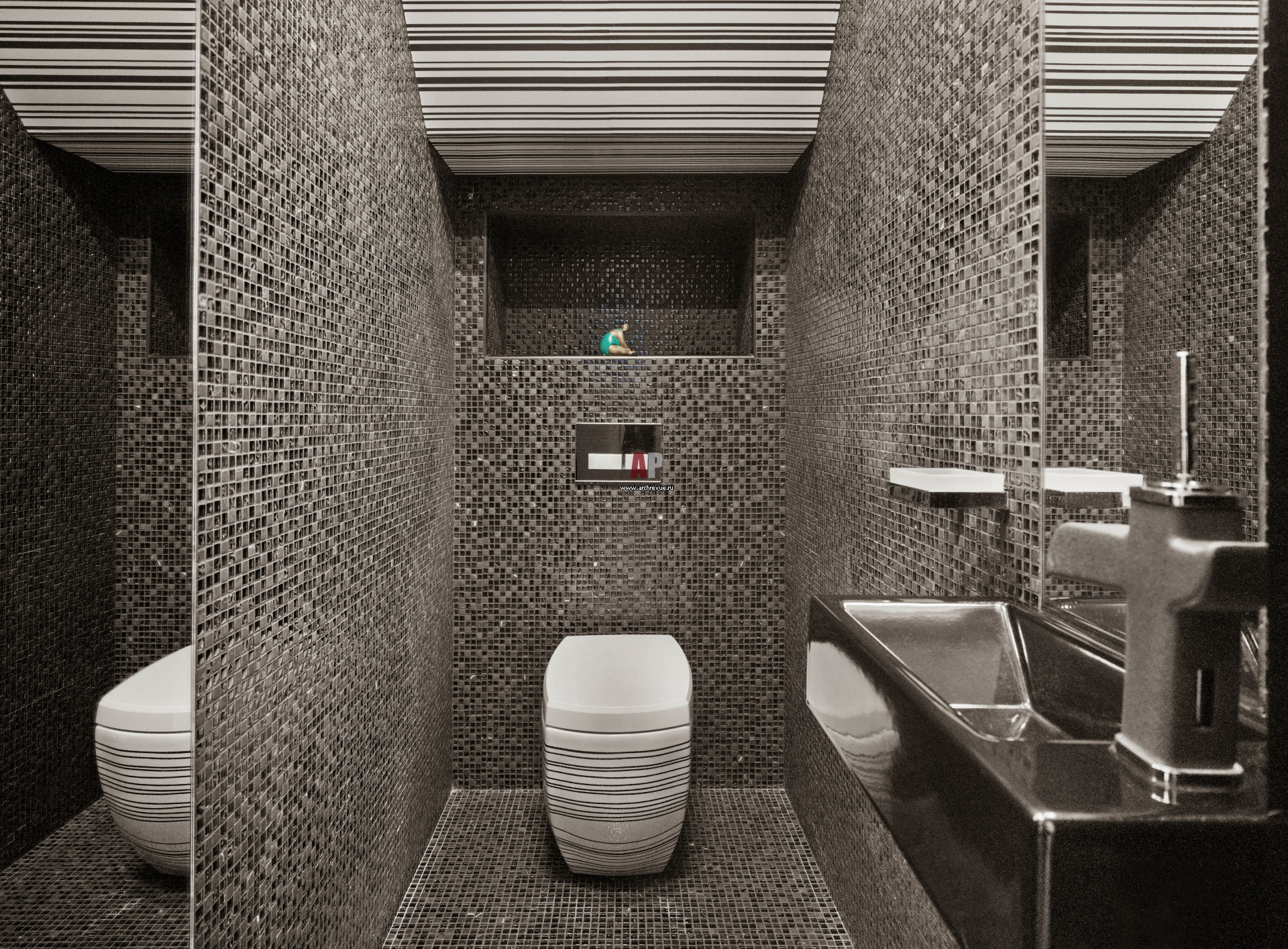 Интерьер гостевого санузла решен в минимализме. Стены облицованы серой мраморной мозаикой.