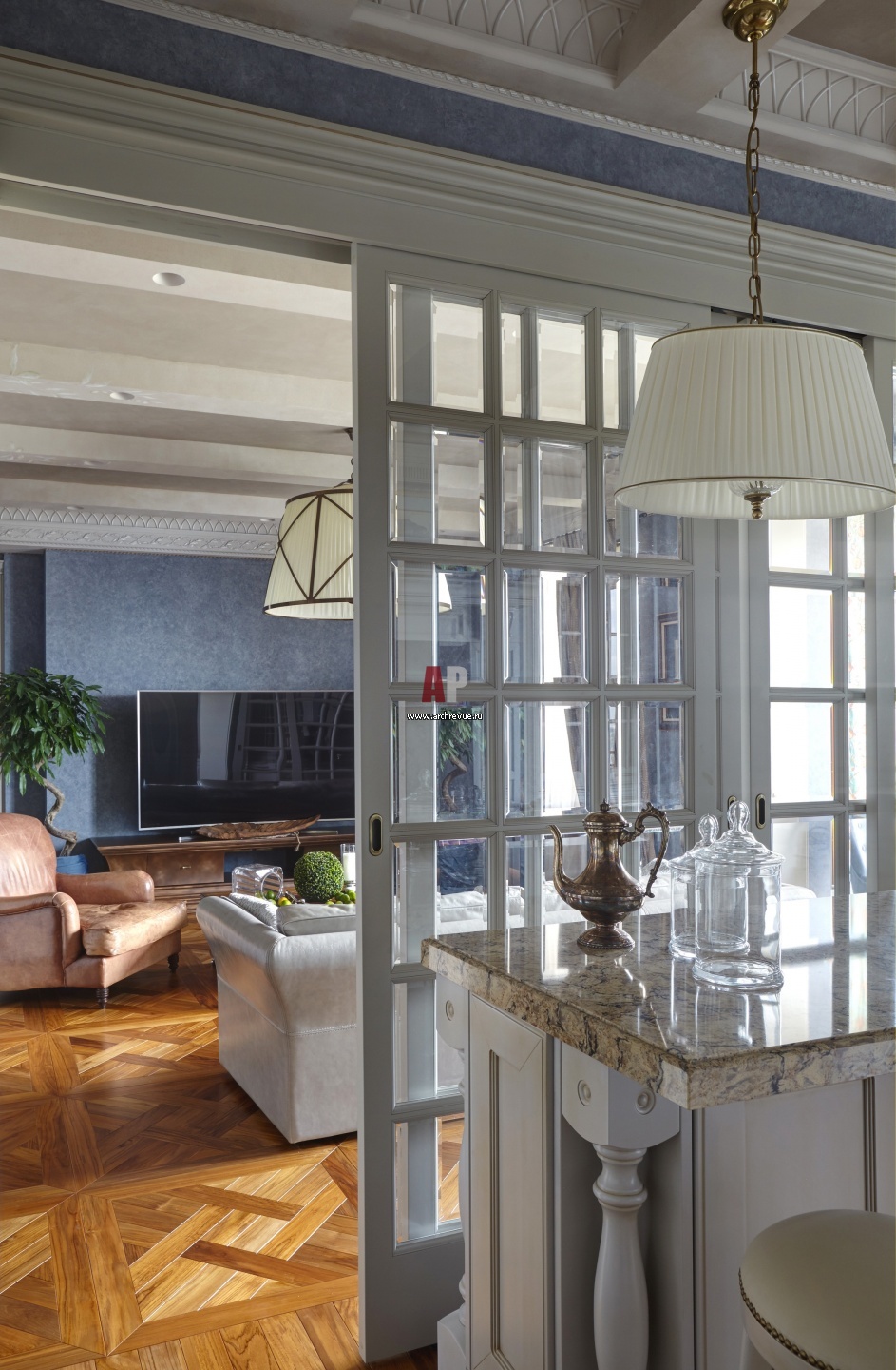 Лазурные стены в интерьере квартиры на одном из последних этажей высотного здания не случайны. Они рифмуются с цветом неба за окном и отражают пожелания хозяева жить в цветном и ярком интерьере.