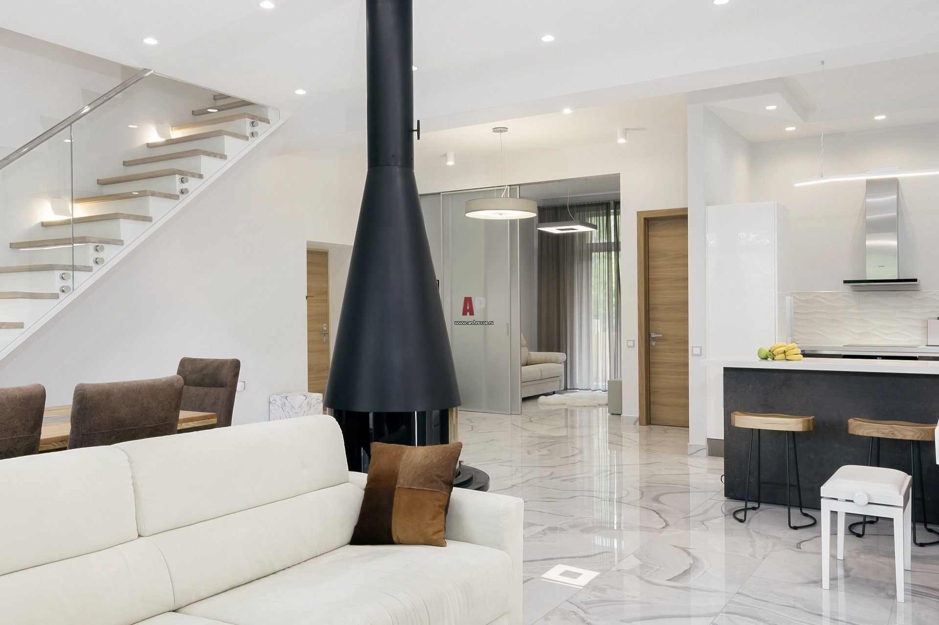 На первом этаже от зоны отдыха отделен кабинет: его зонируют перегородки из матового стекла. Из стекла и металла выполнена устремленная вверх лестница, примыкающая к стене.
