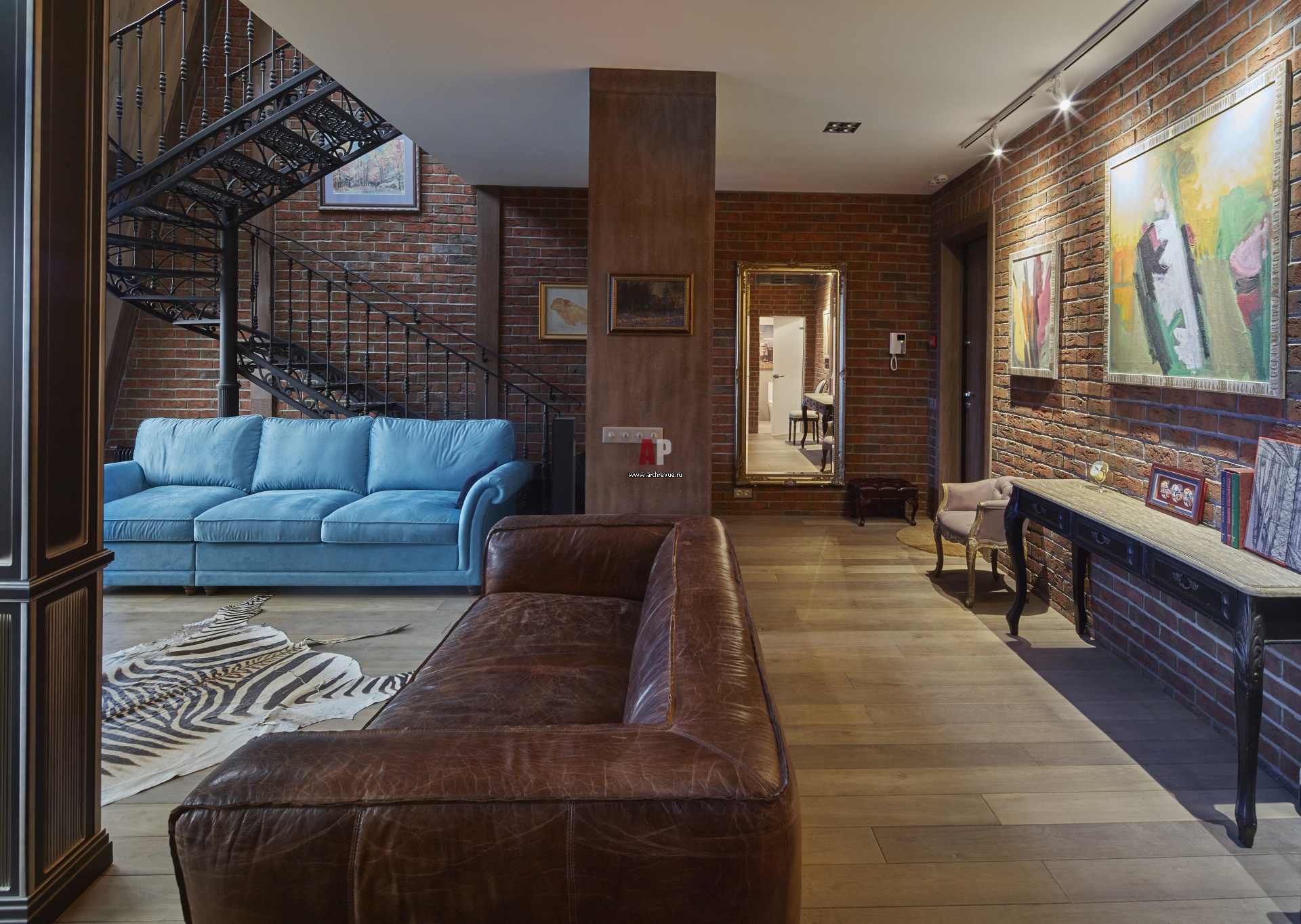 Вид со стороны гостиной на зону прихожей. Стены отделаны качественным облицованным кирпичом, Wienerberger. На полу – светлая дубовая доска под маслом.