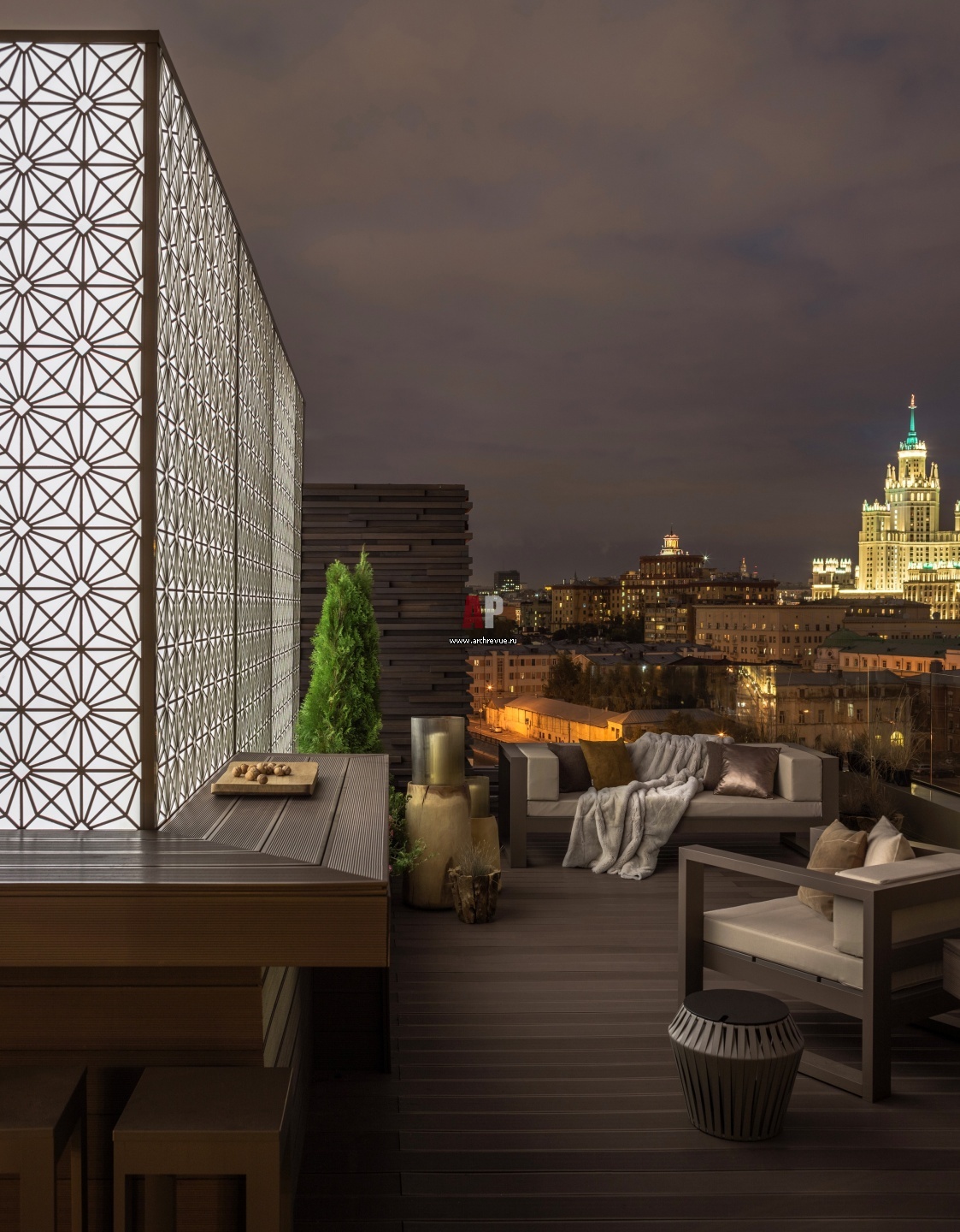 Открытая веранда на крыше московского пентхауса. Светящийся ажурный объем – крытая терраса с зоной отдыха.
