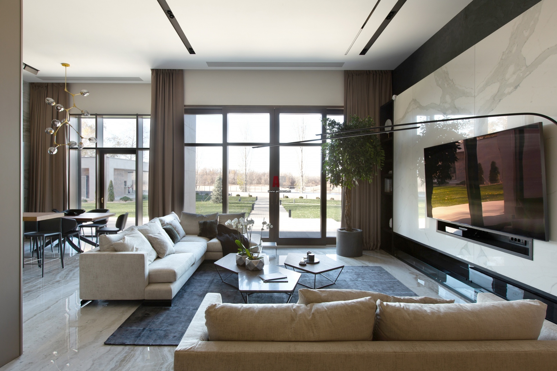 Общая гостиная с панорамными окнами. Стена за ТВ со встроенным биокамином облицованна крупноформатным керамогранитом Iris FMG из серии Max Fine с текстурой белого мрамора. Плоскость облицовки составляет 4 5 метра. Белый камень обрамлен шпоном черного сланца.