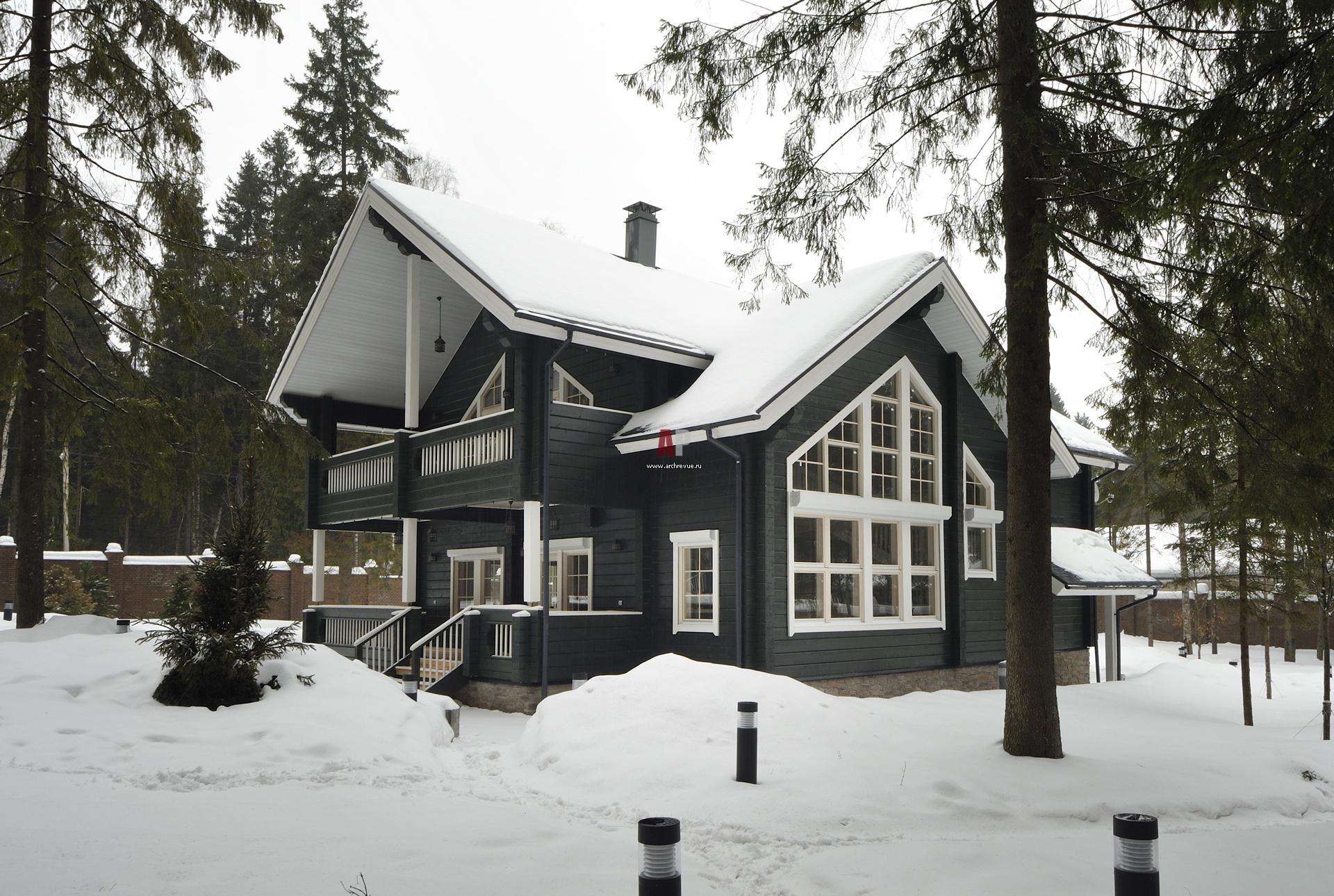Фото финского дома из бруса. Компактную постройку венчает крыша с большими выносами. Она защищает стены и расположенную перед входом террасу от дождя и снега. Фасады дома выкрашены плотной непрозрачной краской насыщенного темно-зеленого цвета. Наличники и ограждение веранды и балкона сделаны по контрасту белыми.