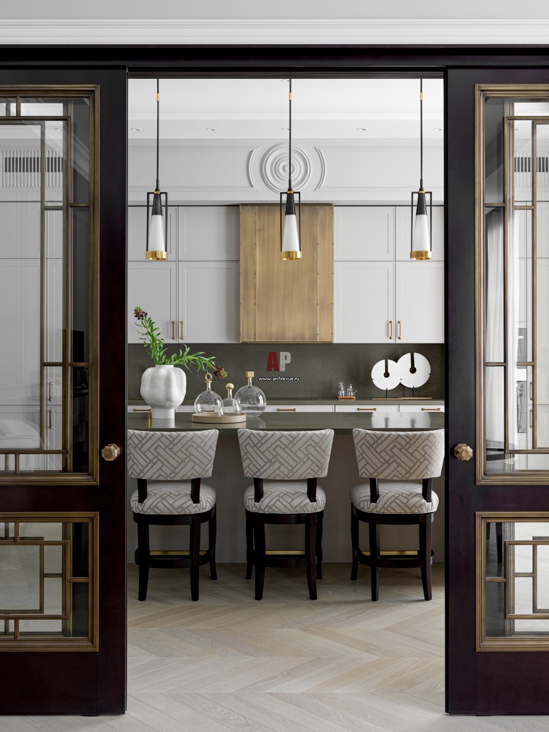 От общей гостиной-столовой кухня изолирована авторскими дверями с отделкой в стиле ар-деко. Кухонная вытяжка сделана из листов латуни с декоративной проклепкой.