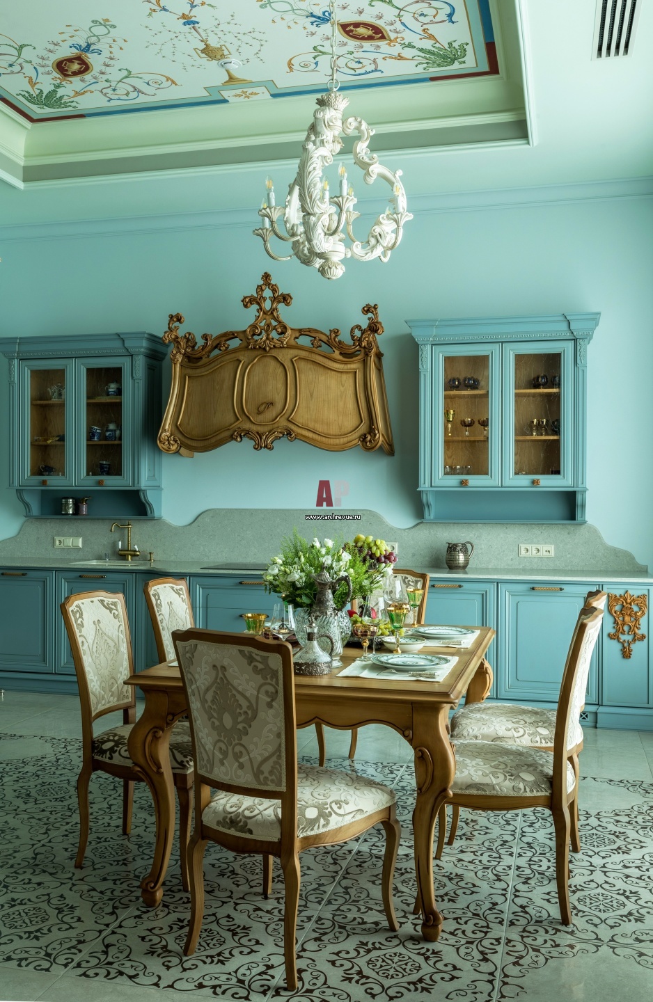 Парадный классический настрой усиливает симметричная кухонная композиция. Края гарнитура не примыкают к стенам. Невысокий фартук выполнен в одном материале со столешницей, округлость его верхнего края рифмуется с плавностью форм мебели.