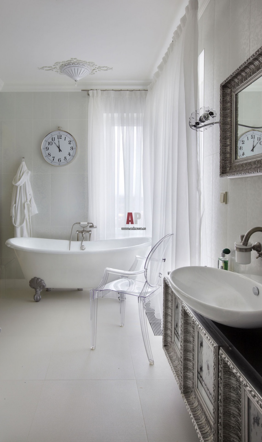 Белая хозяйская ванная комната с панорамным, французским окном. Отдельностоящая ванна на посеребренных ножках, Devon & Devon.