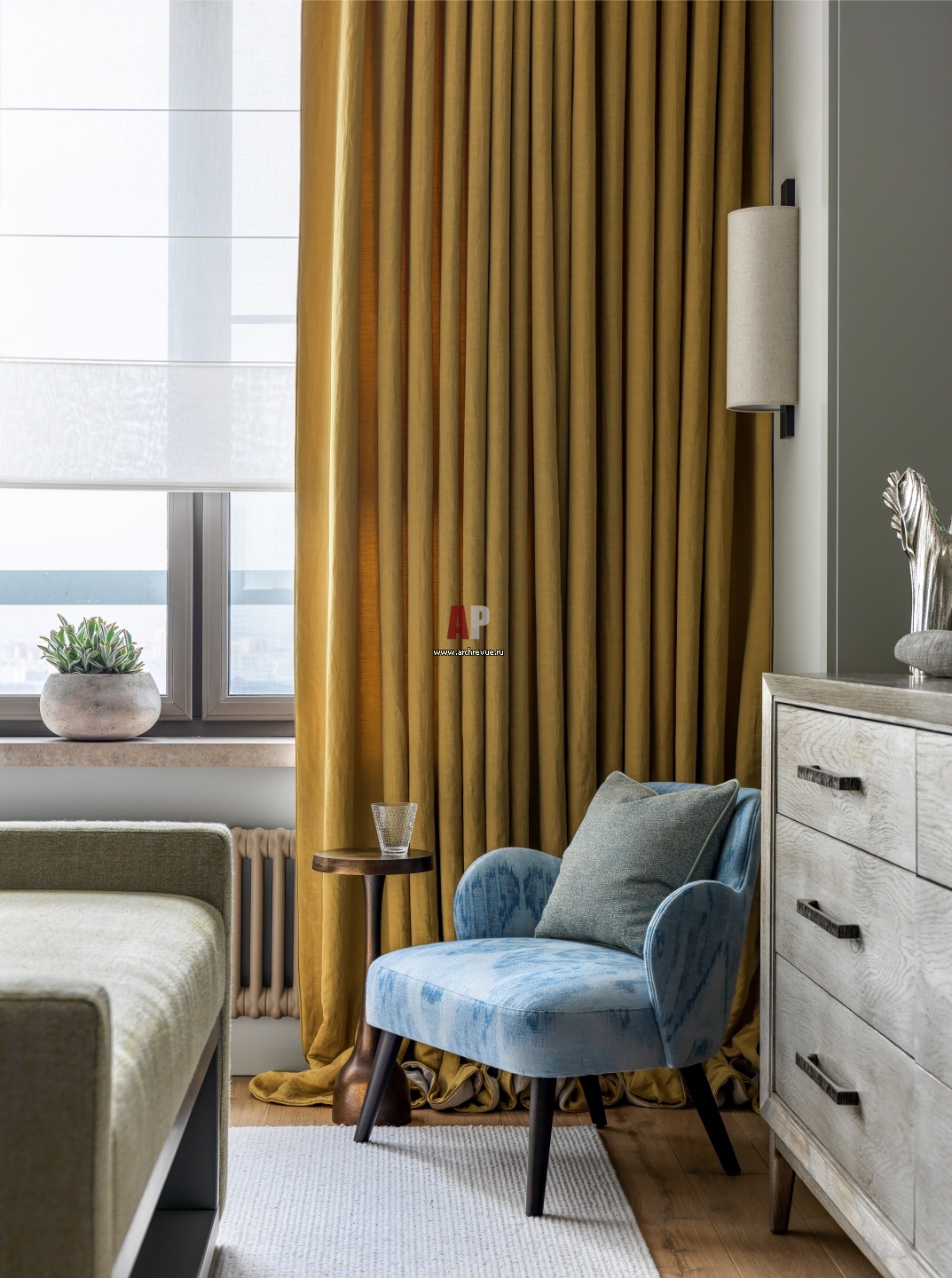 Квартира с настроением цветущего луга. Интерьер спальни. Комод, Hickory White. Кресло, Marie's Corner в обивке тканью Robert Allen. Столик около кресла, Bernhardt. Настенные светильники, Stephane Davidts.