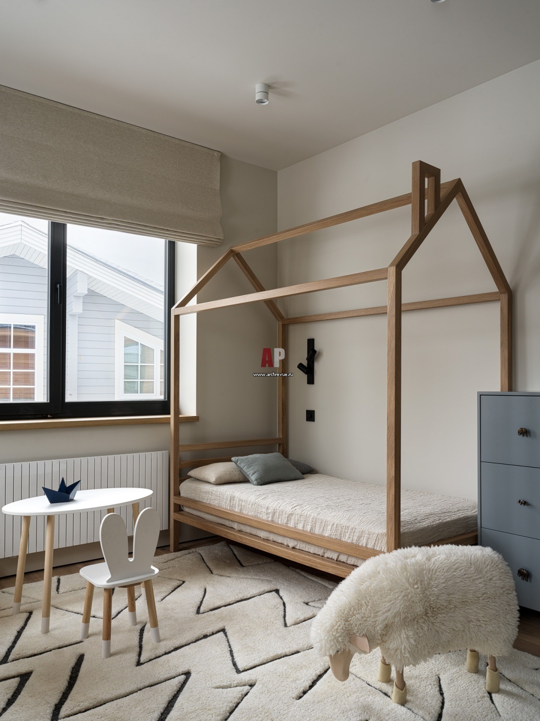 Современный двухэтажный дом в поселке «Репино парк». Спальня дочери. Кровать и корпусная мебель, на заказ, по эскизам дизайнеров.