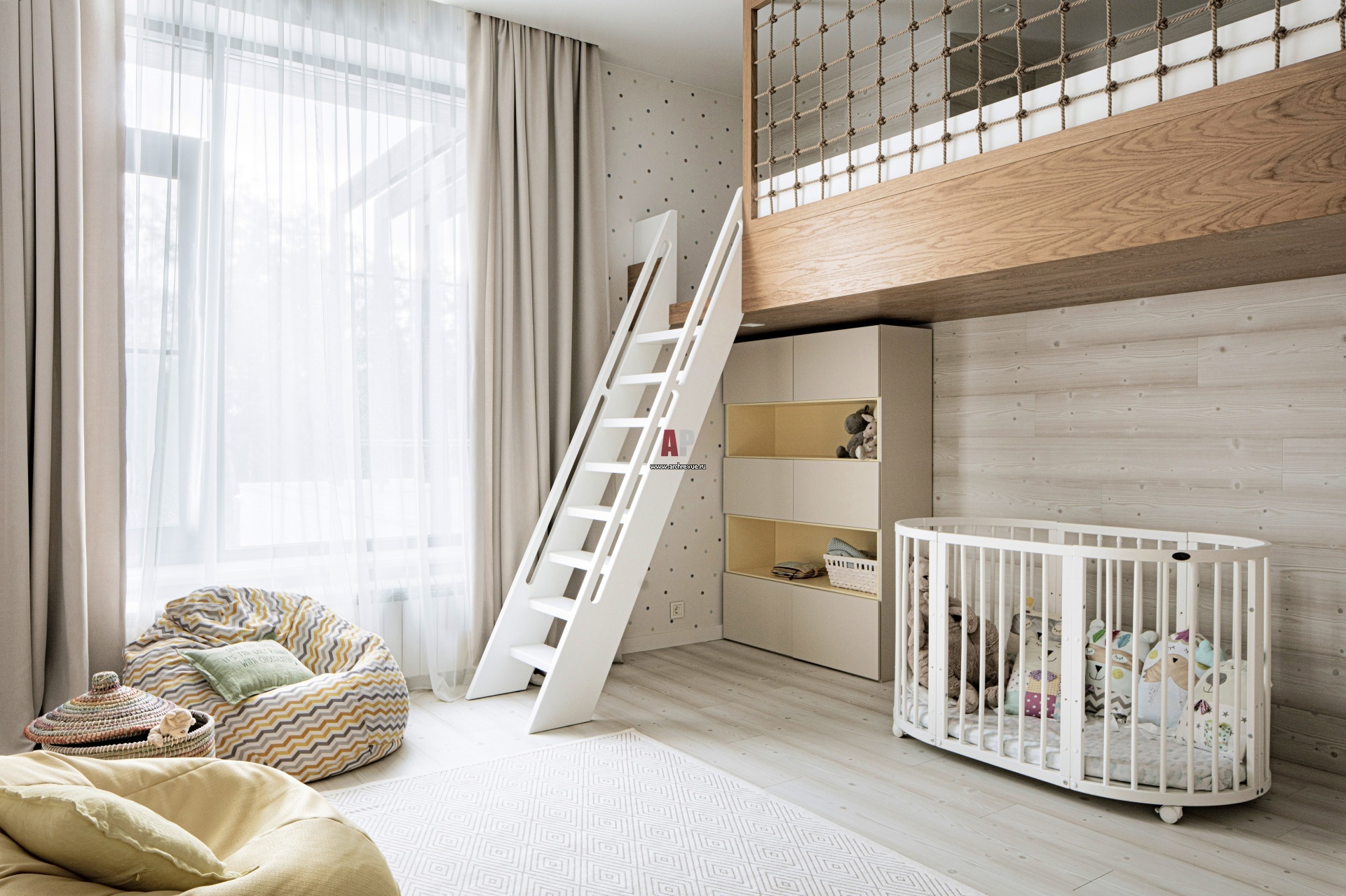 На втором этаже находится три детских комнаты. На момент начала строительства дома в семье было трое детей, а в процессе родился четвертый. Дизайнеру пришлось на финальном этапе изменить планировку и добавить еще одну детскую.
