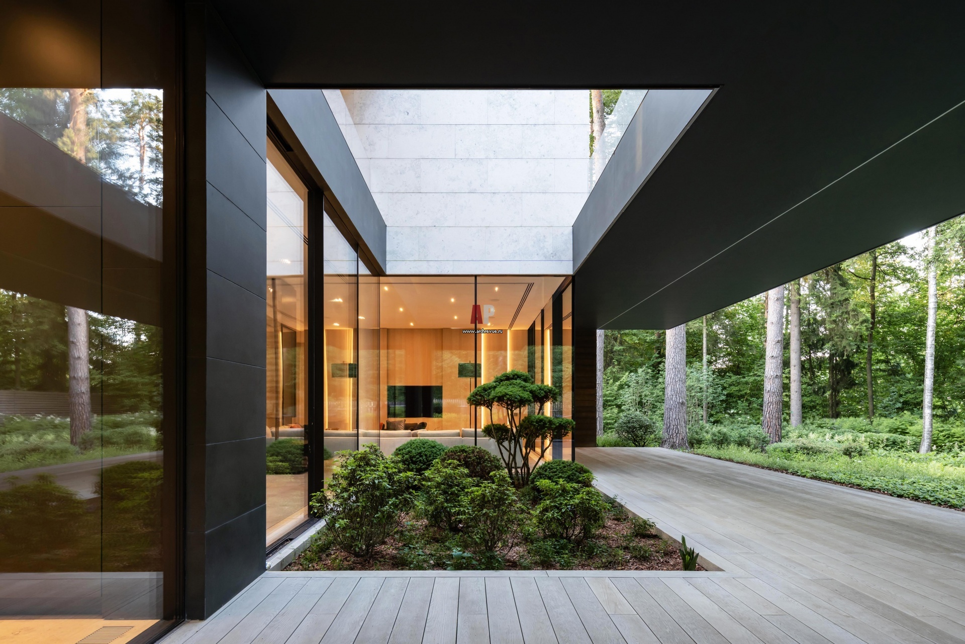 Световой колодец обеспечивает хорошую инсоляцию парадных помещений первого этажа в течение всего дня. Полы открытой террасы выстланы декингом.