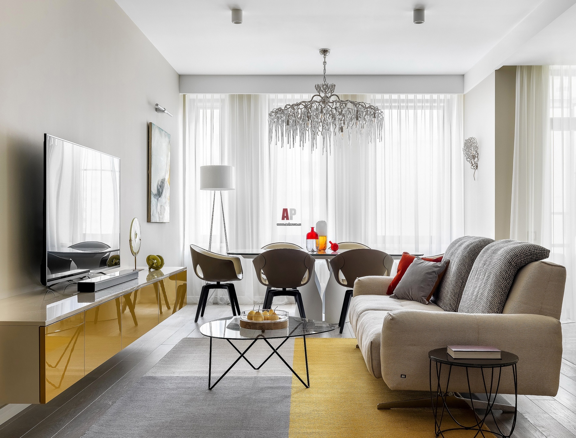Акценты светлой гостиной – яркая мебель сложного горчично-желтого цвета. Консоль под ТВ, MisuraEmme. Кожаное кресло, Poltrona Frau. Диван и придиванный столик, Rolf Benz. Журнальный стол, Gubi.