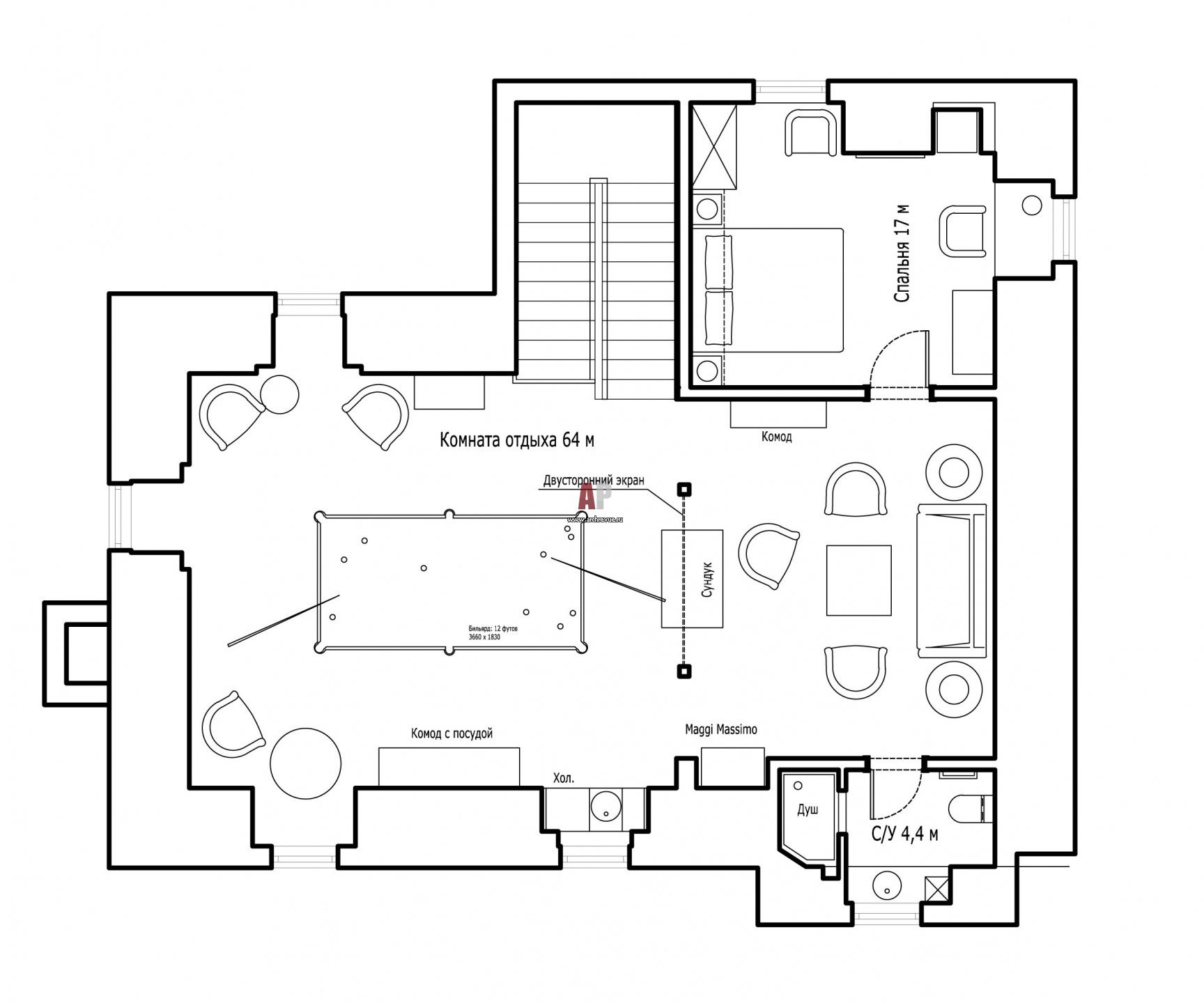 Планировка мансардного этажа классического трехэтажного особняка в поселке «Трувиль». Общая площадь – 400 кв. м.
