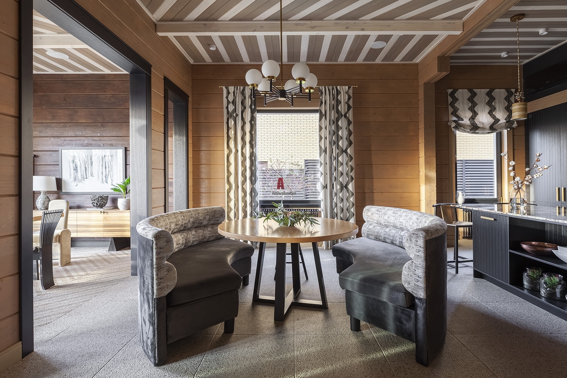 К кухне примыкает терраса. Здесь организована приватная зона для завтраков, за которой хозяева полюбили работать. Мягкая группа сделана на заказ.
