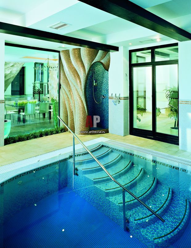 Бассейн благодаря практически сплошному остеклению фактически становится одним из главных элементов жилого пространства.