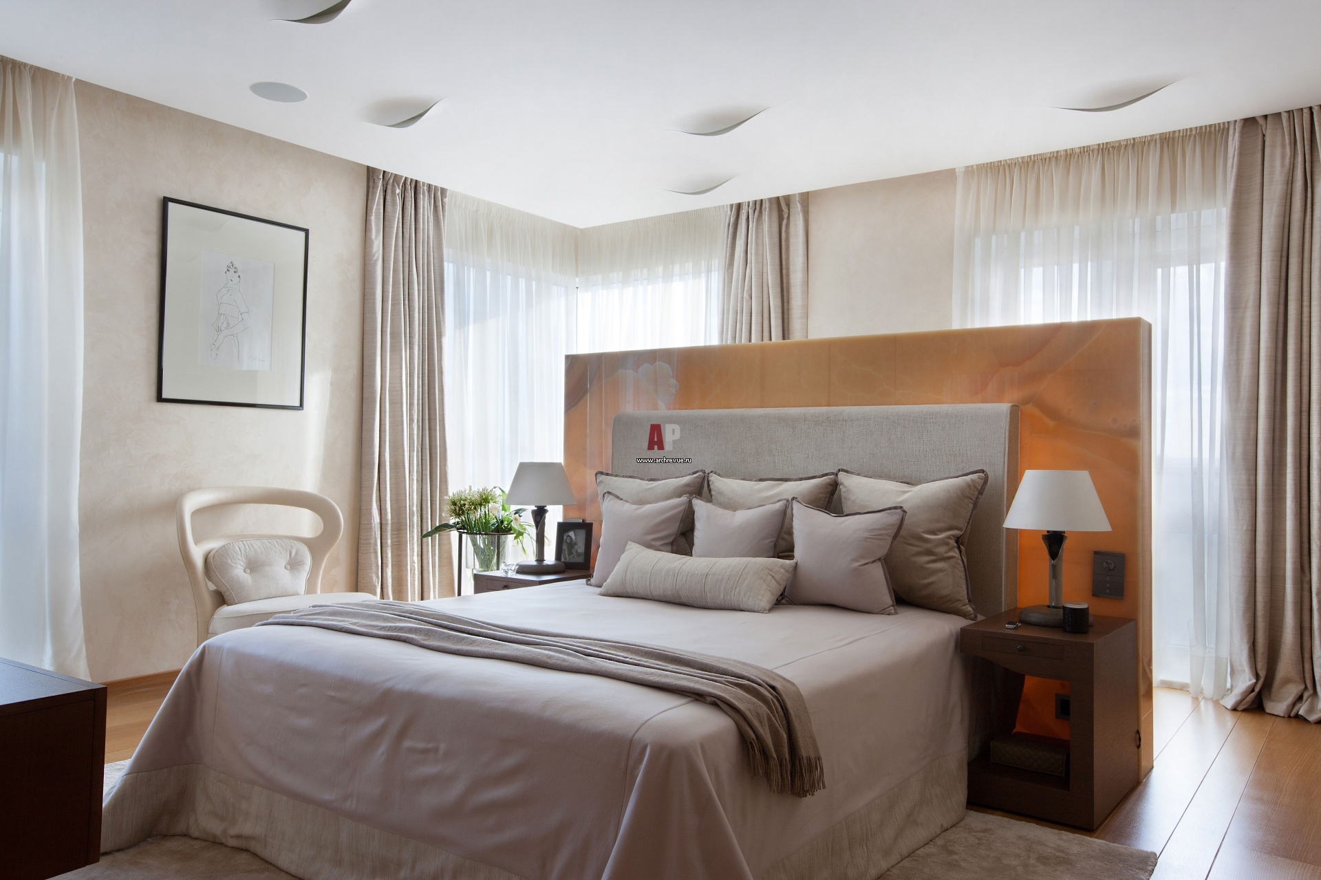 Хозяйская спальня расположена в угловом помещении с панорамными окнами. Кровать king size от окна отделена изголовьем из оникса. С обратной стороны к нему примыкает туалетный столик. Потолочный свет, Ingo Maurer. Светильники подминают нераскрывшуюся раковину и вмонтированы в плоскость потолка. Кровать, Promemoria.