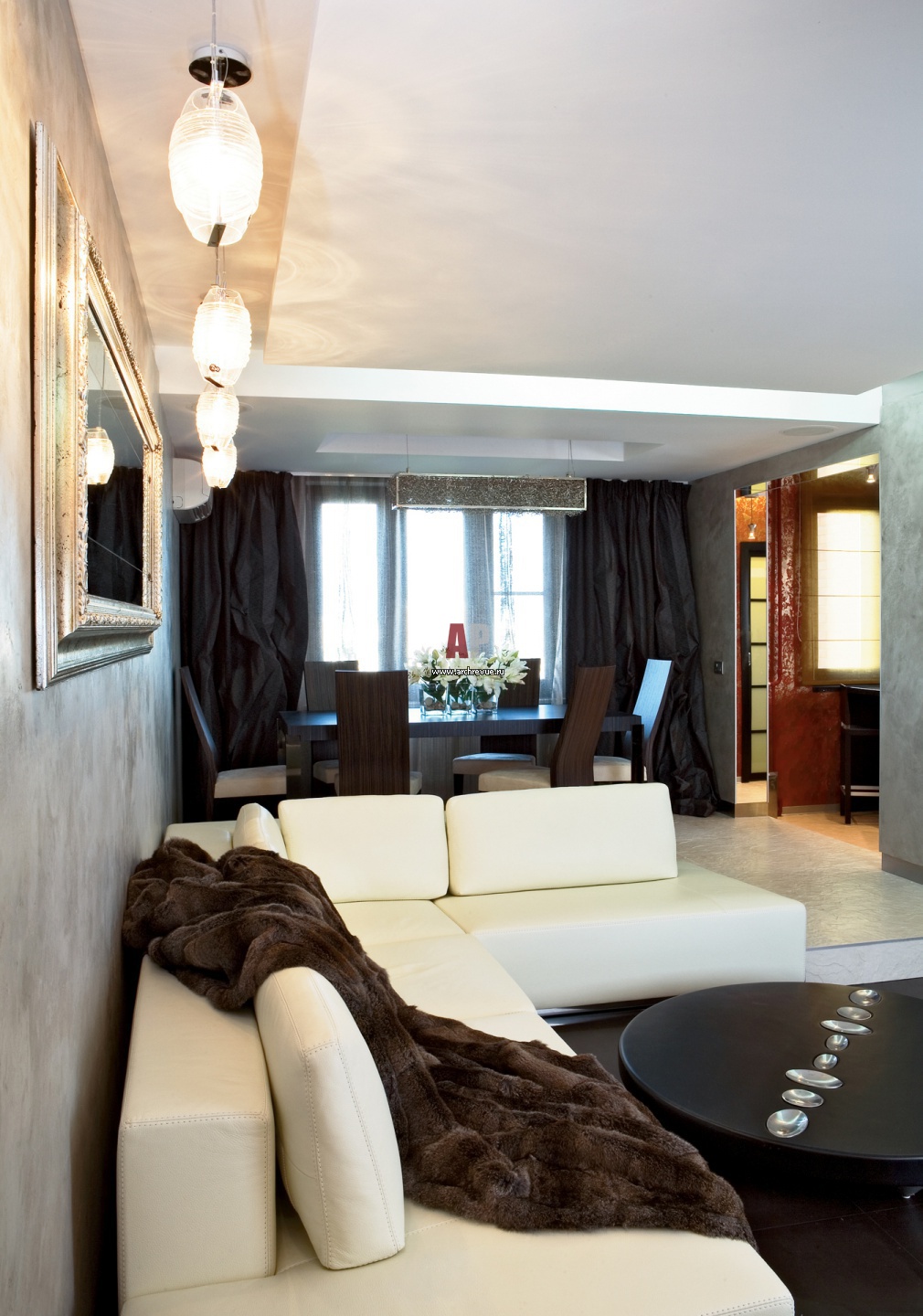 Вид со стороны зоны отдыха на столовую. Черно-серая цветовая гамма. Широкие торцы стен декорированы зеркальными полотнами.