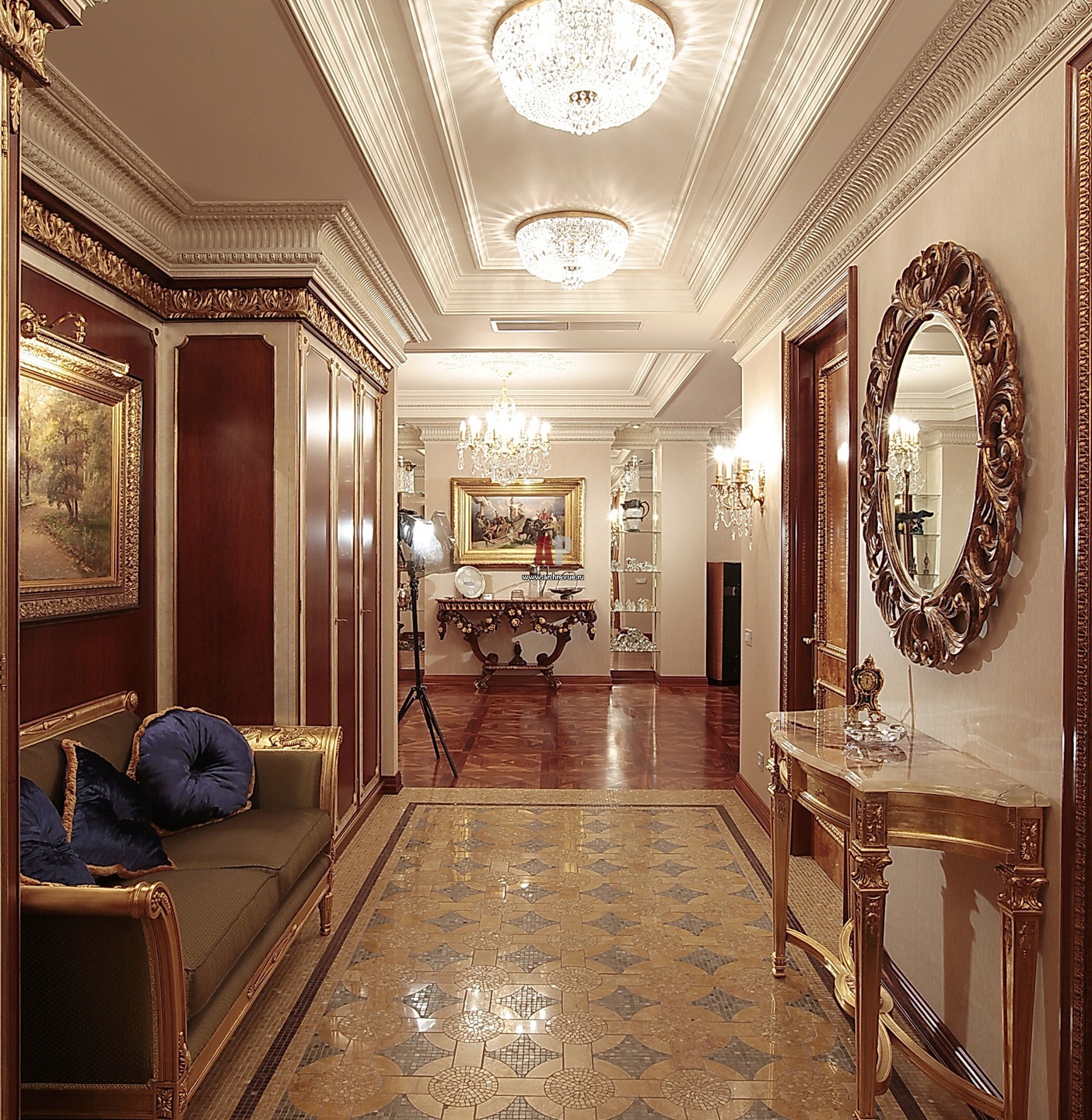 Входная зона – парадное помещение, превращенное в галерею. Здесь выставлена коллекция искусства хозяина. Пол украшен роскошным панно из мраморной мозаики. Встроенные шкафы Jumbo.